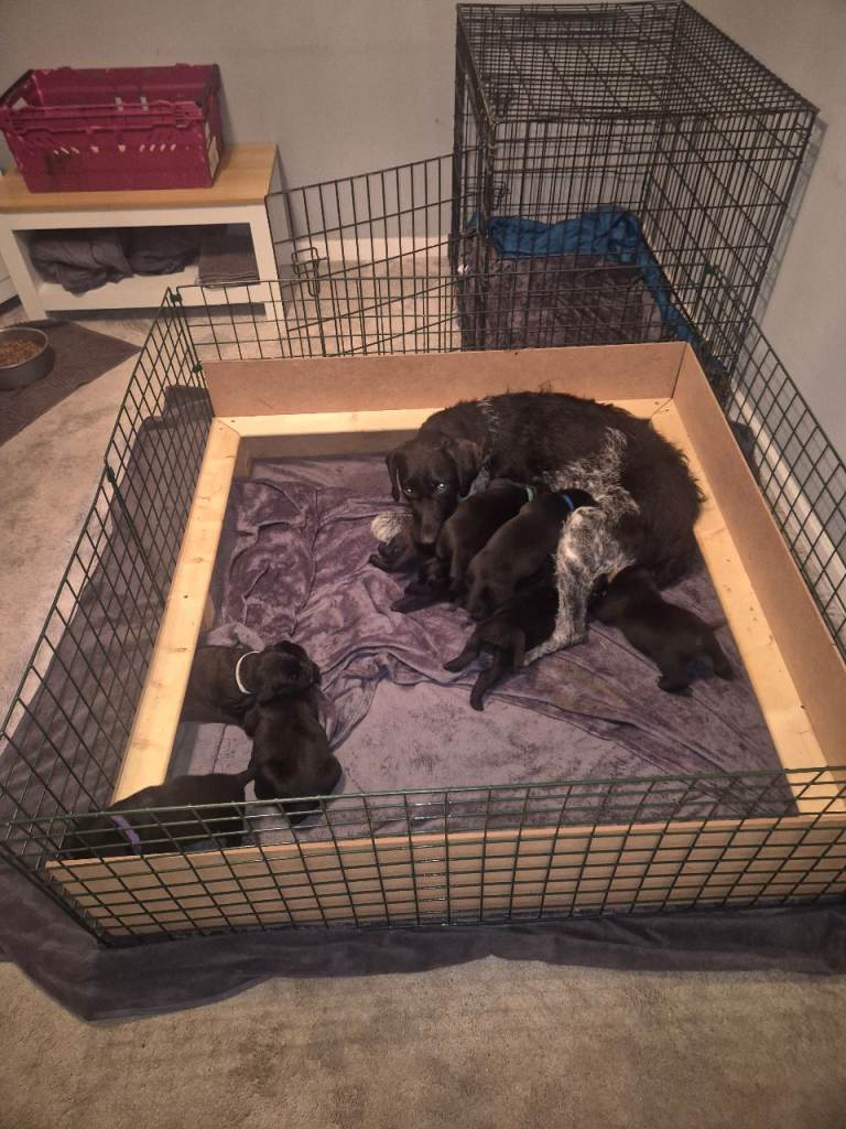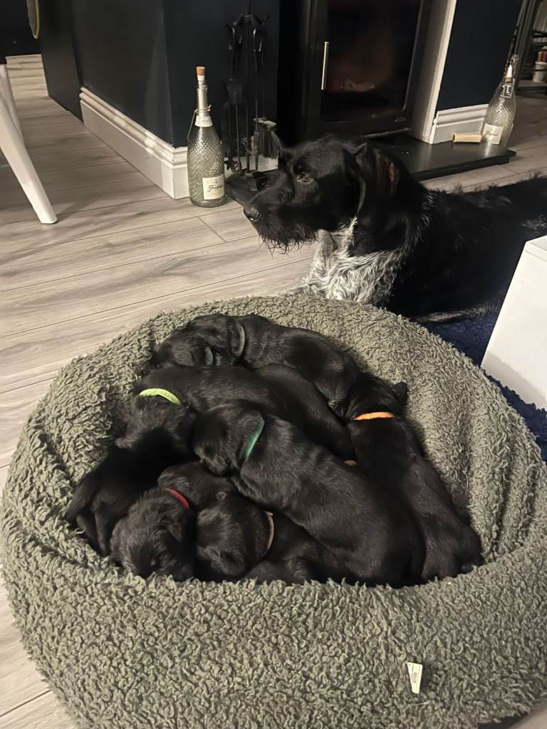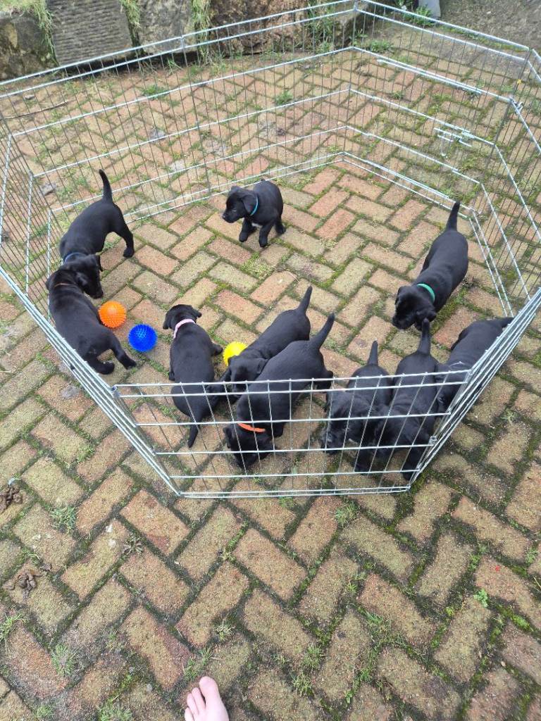 9 males left . All pups black coloured some are developing a chocolate colour and some have white markings on their chests . These puppies shall be easy to train and will have great natures like their parents when older . Both perents are great round children and are great family dogs.