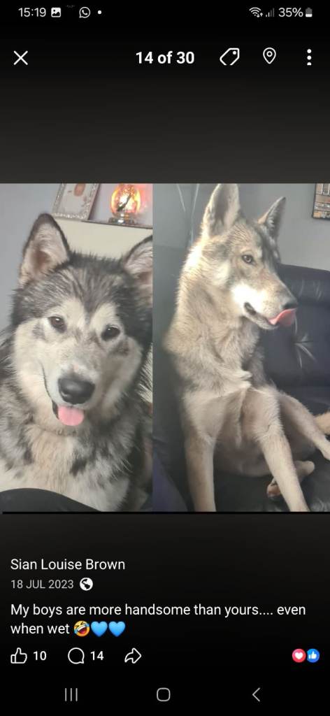2 beautiful huskies. Bow and bear. Alaskan and a malamute. Both fab temperament, brilliant with cats, kids and other dogs. Approx 4 year old. Rehousing due to ill health £200 each or £300 for the 2