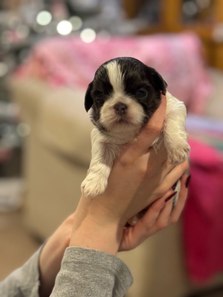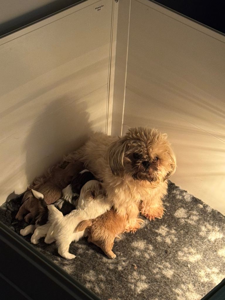Our gorgeous girl has given birth to 5 stunning full pedigree KC registered male shih tzu puppies with gorgeous colourings. 1 already reserved