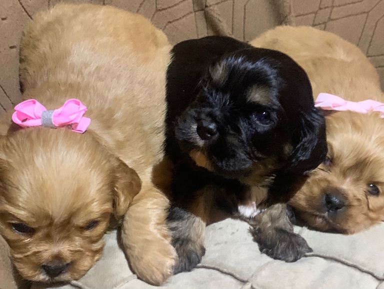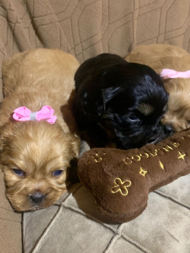 We are over the moon to introduce our gorgeous girls litter she has had 3 unbelievable puppies 2 cream and white girls and a black and white boy , mum is the most lovely natured girl and has been a fantastic mum to these babies we chose the most gorgeous tiny imperial boy and was a complete success, these puppies are pedigree and will leave vaccinated , microchipped, wormed and flead ect , only 5 star homes for these babies very well socialised also In a family home , please don't hesitate to contact for any information , please note these puppies are not ready to leave yet and but will be ready mid February