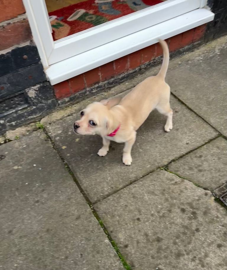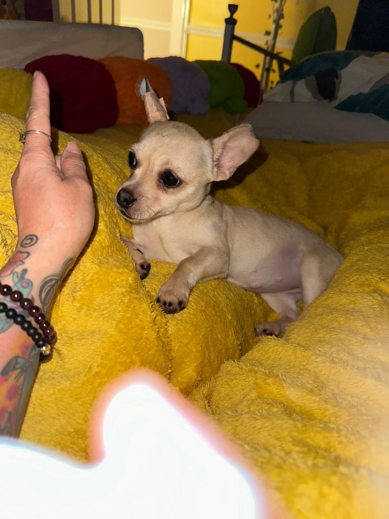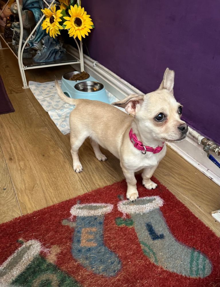 Miniature Jack Russell x Chihuahua puppy. She is 8month looking for her new loving due to granddaughter allergic to dog. Gets on with other dog but not sure about cats. Message for More info