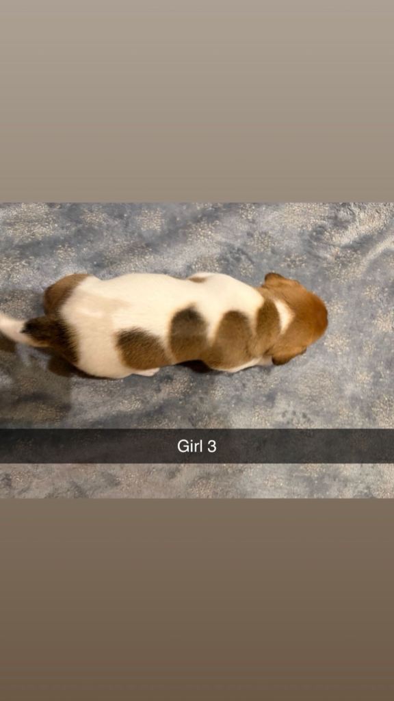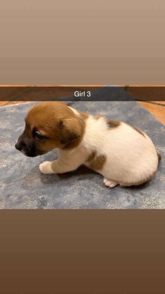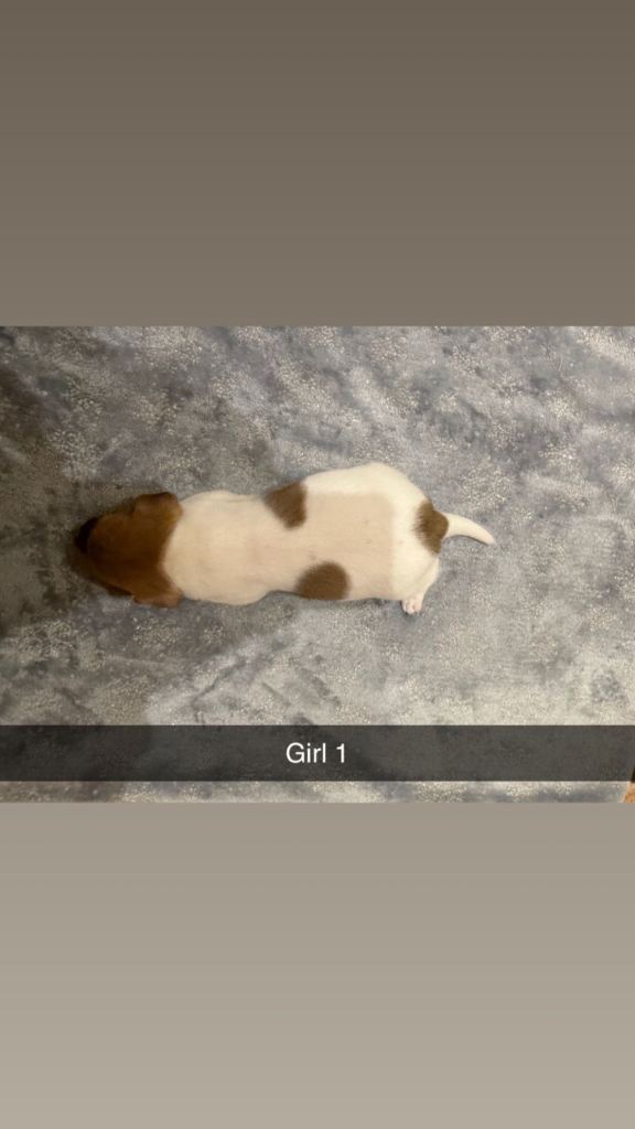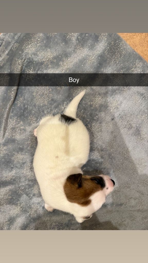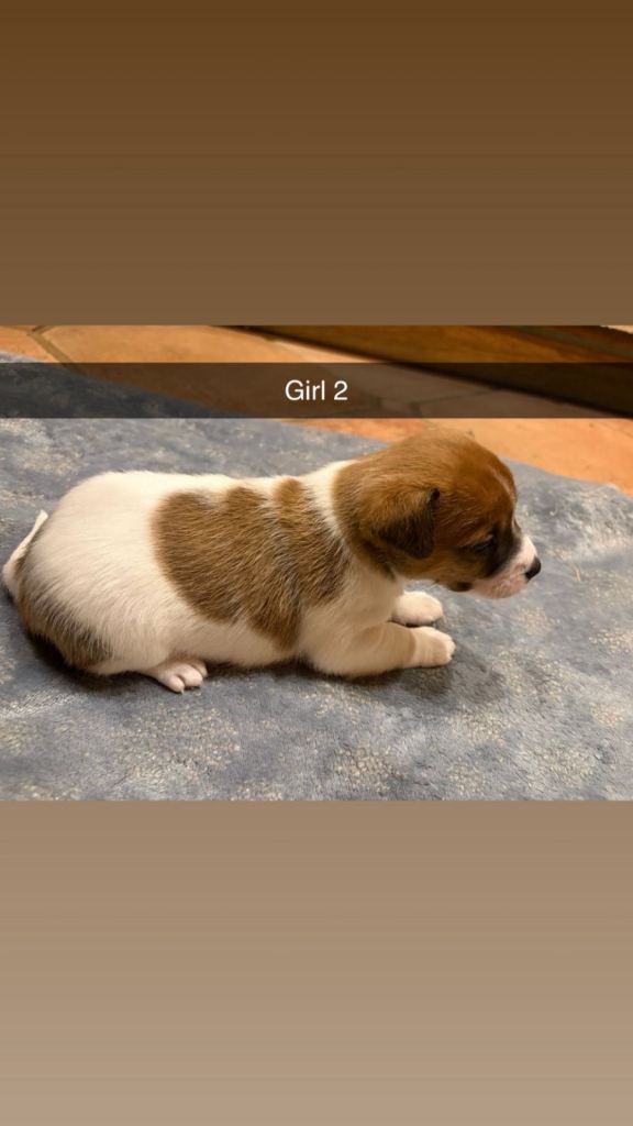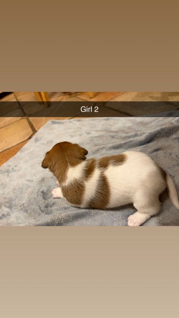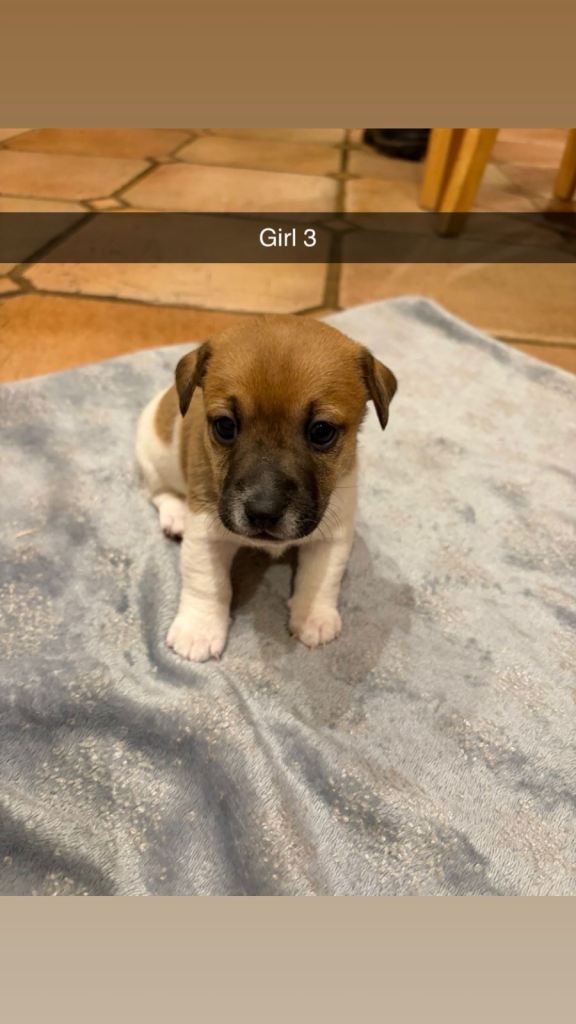 Traditional short legged Jack Russell puppies for sale. 1 boy, 3 girls. Both mum and dad can be seen. Mum and dad are both much loved family pets. Both mum and dad are good with children, cats and other dogs. DOB 27 march. Will be ready to leave on 22/05/26 at 8 weeks. Puppies will be wormed, flead, microchipped and first vaccinations. Boy £650, girls £700