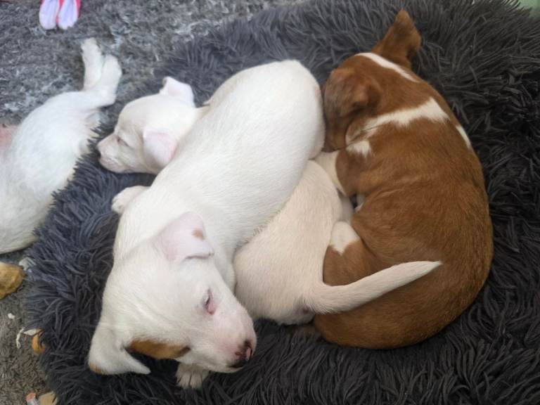 We have 1 beautiful white boy Jack Russell, he has a patch on one eye and has a lovely tempermant. He is using puppy pads and outside for the toilet.