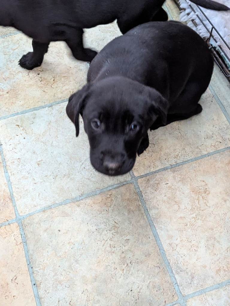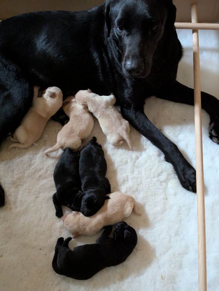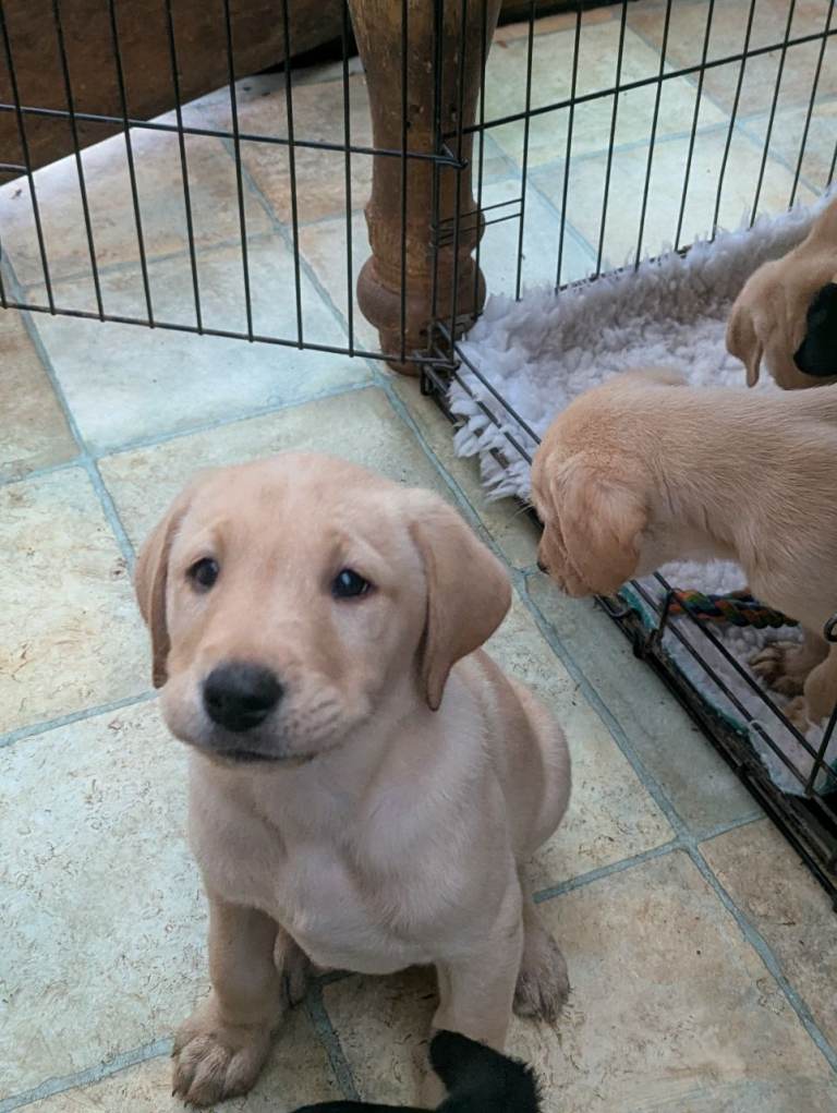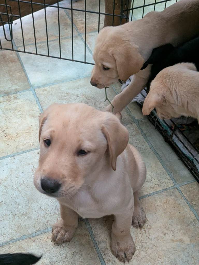 Our beautiful black Labrador Annie has had a litter of 7 Chunky puppies 5 boys and 3 girls.We have left 3 boys .1 black and 2 yellow.They are K C registered, Health checked by our vet, Microchipped.Not vaccinated as different counties have different batch numbers so would have to start again.They can be seen with mum, they live in our house with other dogs,cats and grandchildren.They are weaned into Harrington puppy.They have been wormed regular with panacur.They will leave here with food,toy , blanket smelling of mum,KC registration, and microchip info.Dad is a Stud yellow (see photos).I am available for viewing anytime any questions please ask.£1400