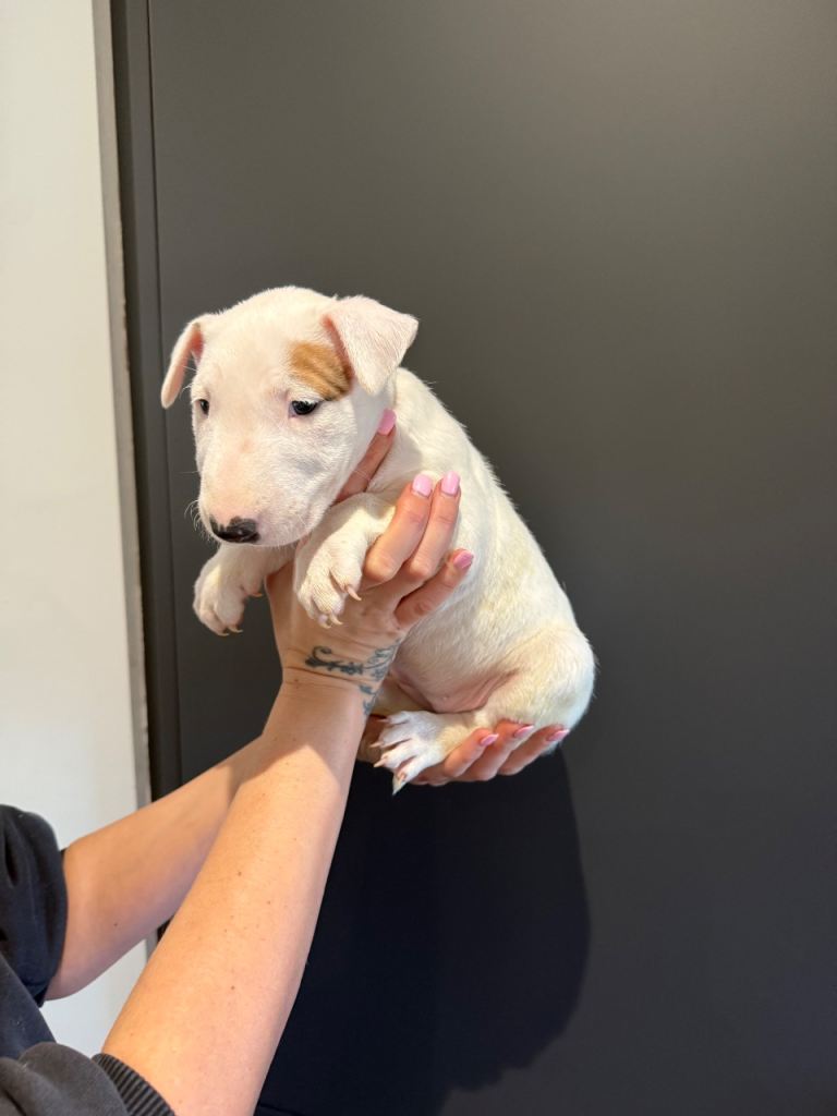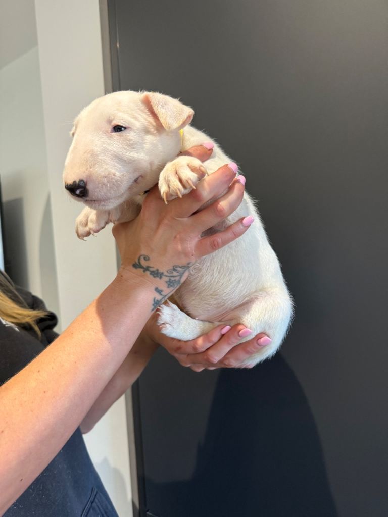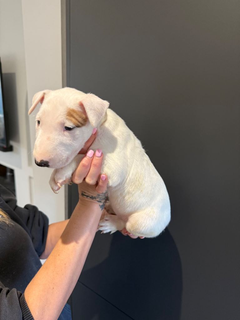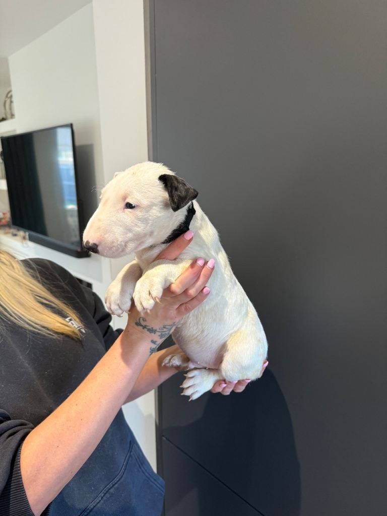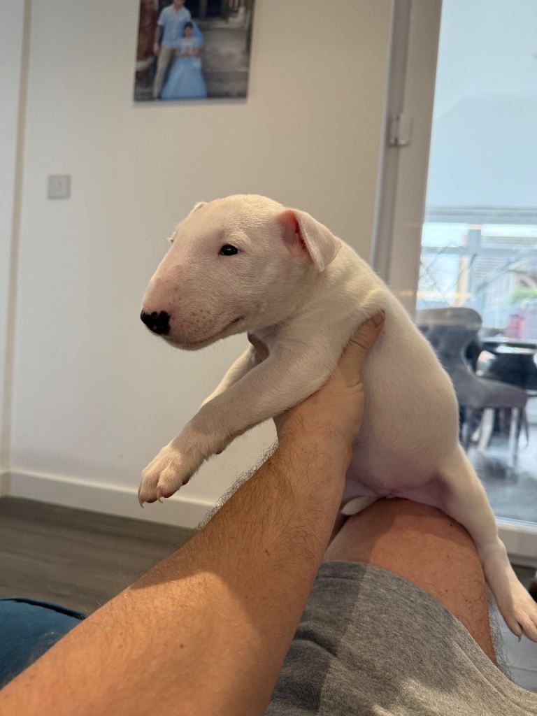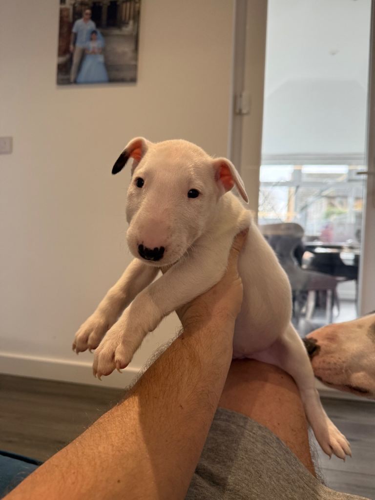 Here we have a litter or exceptionally well bred KC English bull terrier puppies mum is our family pet dottie amongst dotties 5 gen kennel club is multiple champions father is a gorgeous kennel club registered white English bull terrier all pups have had BAER testing both parents are LAD tested and have had there health checks microchip and first vaccine. all puppies are well socialised and used to children. Neither parents has had any problems with food aggression or any aggression in general they are both loving and kind tempered dogs