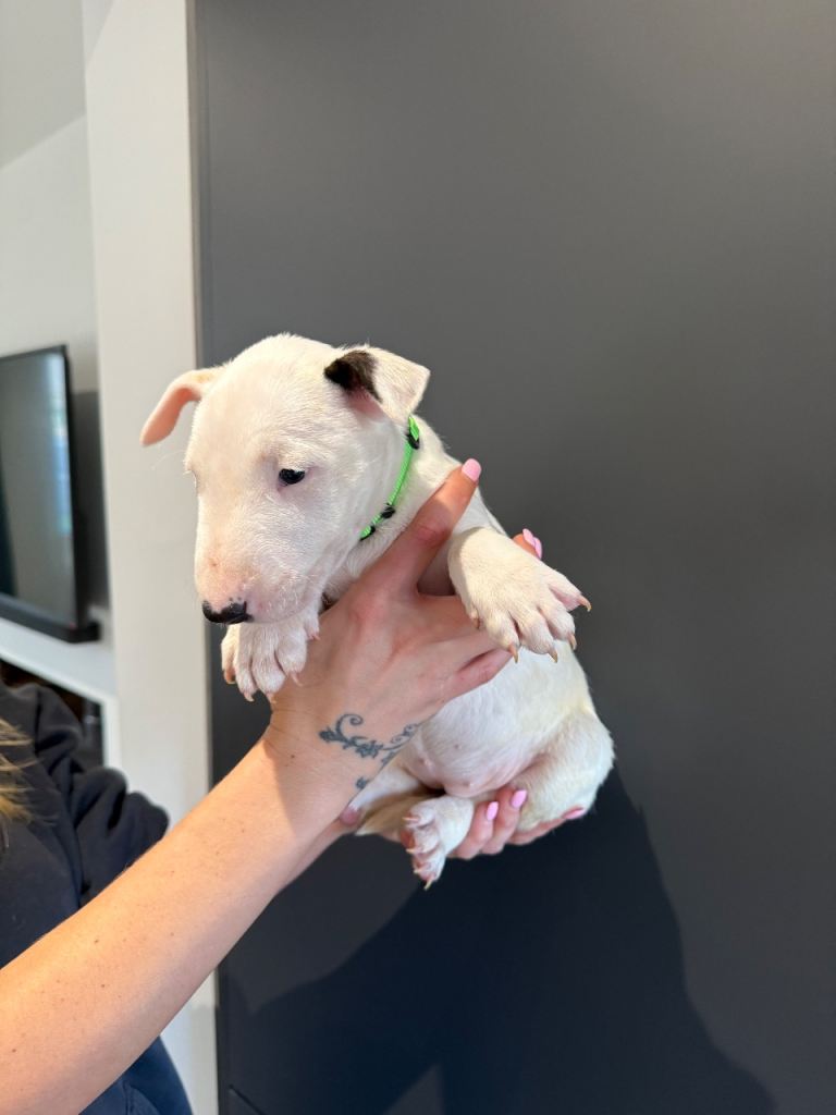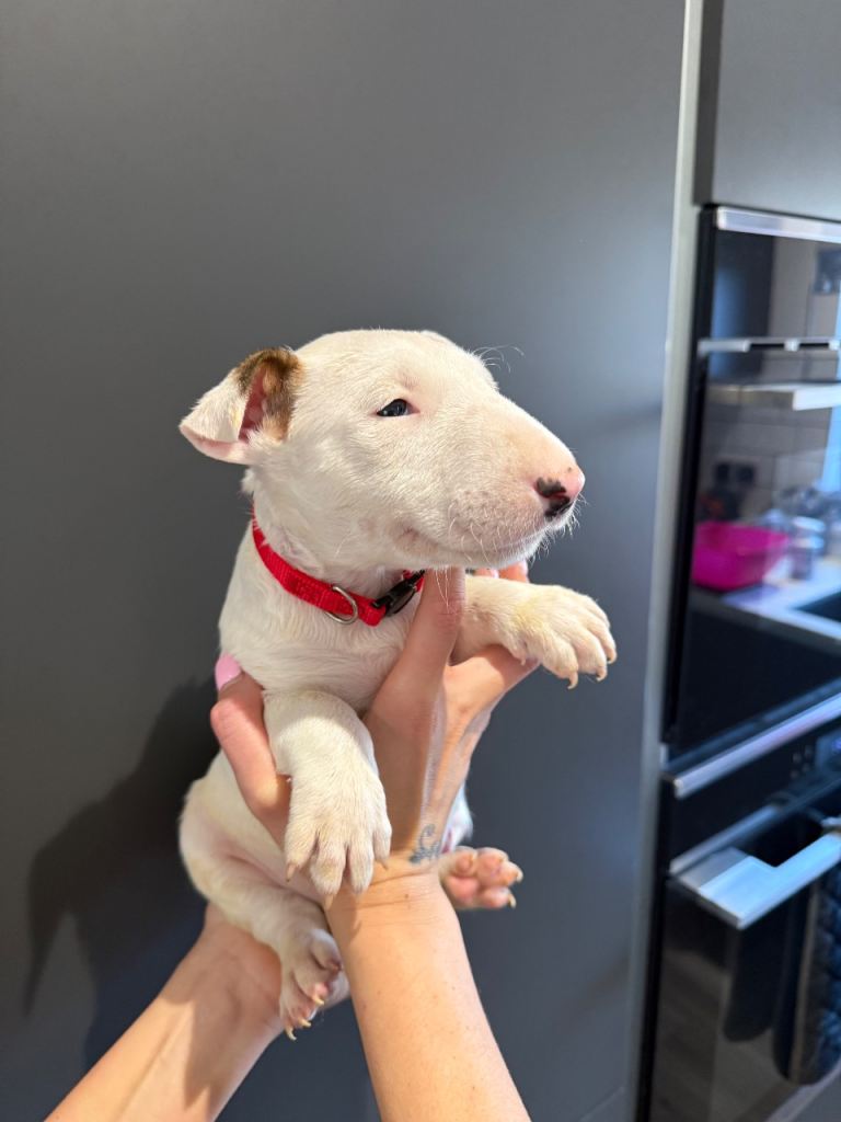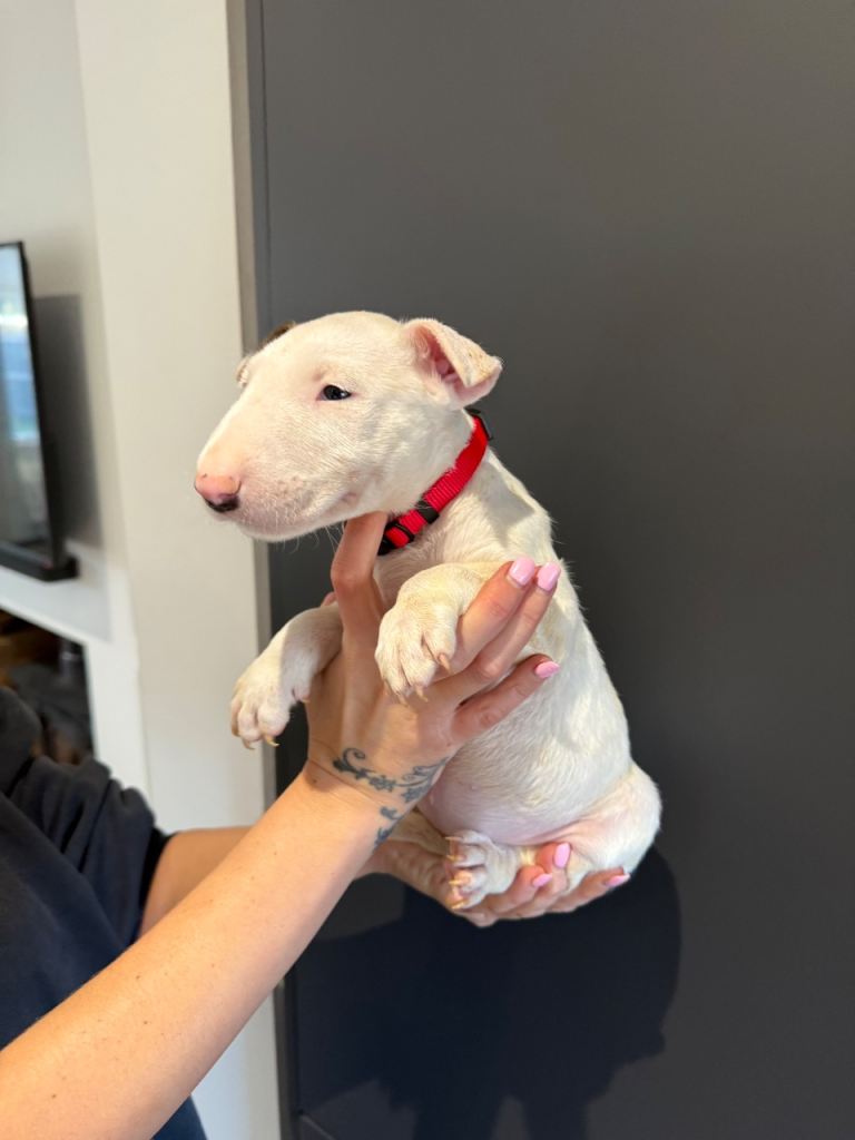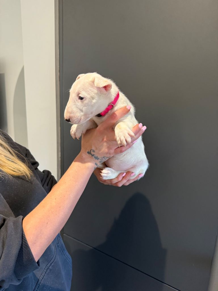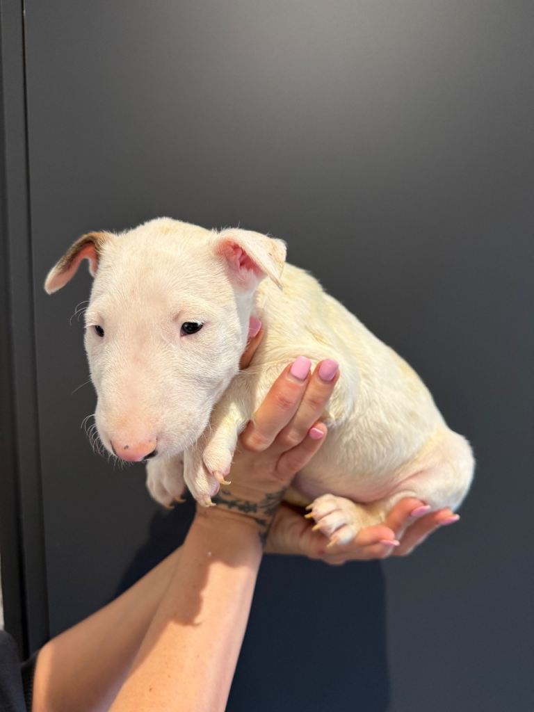 Here we have a litter or exceptionally well bred KC English bull terrier puppies mum is our family pet dottie amongst dotties 5 gen kennel club is multiple champions father is a gorgeous kennel club registered white English bull terrier all pups have had BAER testing both parents are LAD tested and have had there health checks microchip and first vaccine. all puppies are well socialised and used to children. Neither parents has had any problems with food aggression or any aggression in general they are both loving and kind tempered dogs