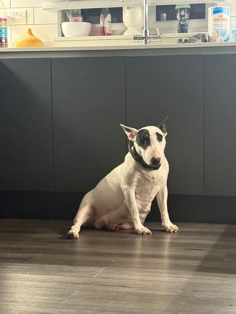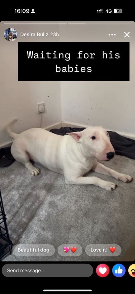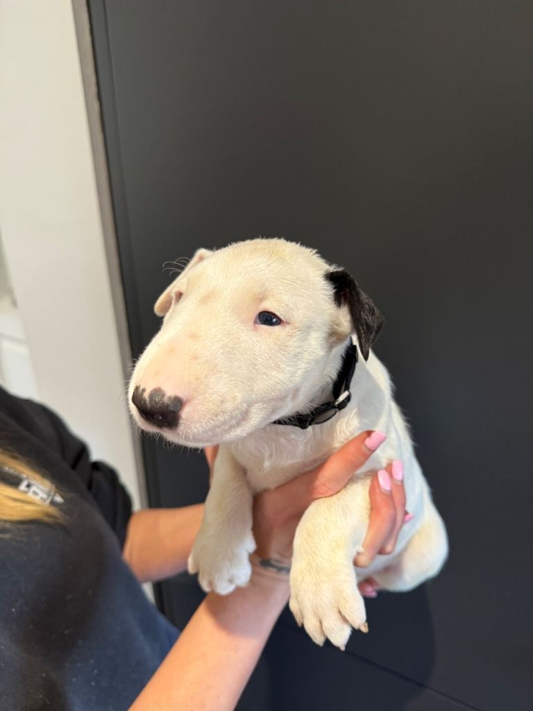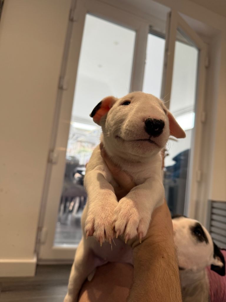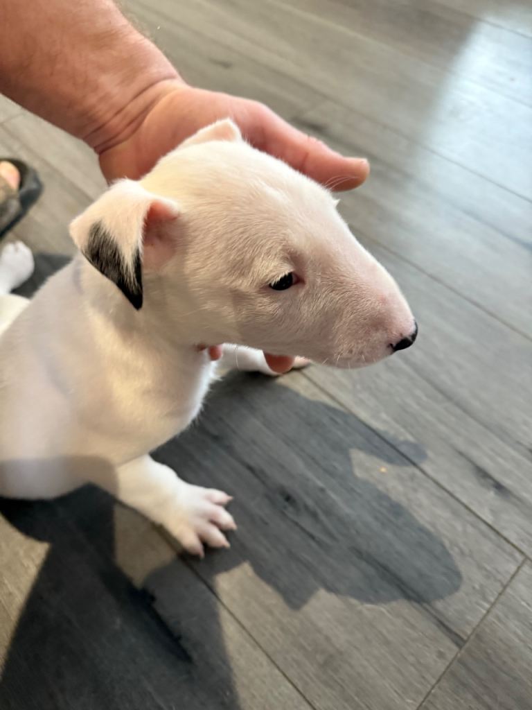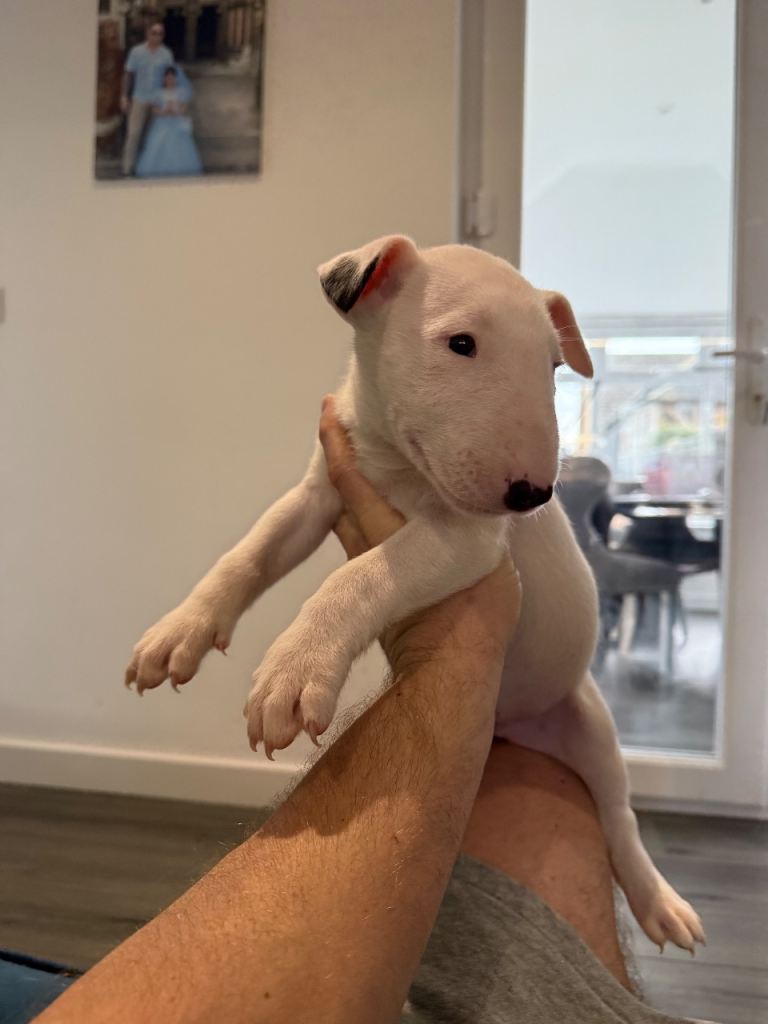 Here we have a litter or exceptionally well bred KC English bull terrier puppies mum is our family pet dottie amongst dotties 5 gen kennel club is multiple champions father is a gorgeous kennel club registered white English bull terrier all pups have had BAER testing both parents are LAD tested and have had there health checks microchip and first vaccine. all puppies are well socialised and used to children. Neither parents has had any problems with food aggression or any aggression in general they are both loving and kind tempered dogs