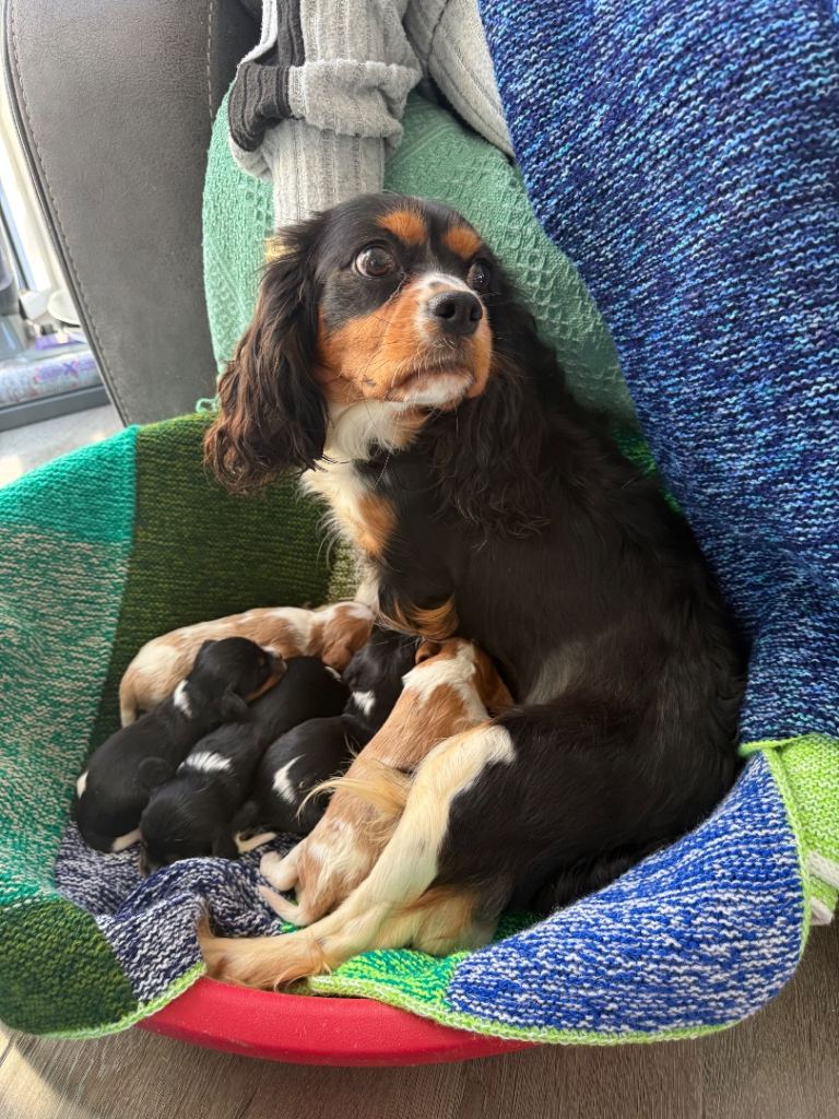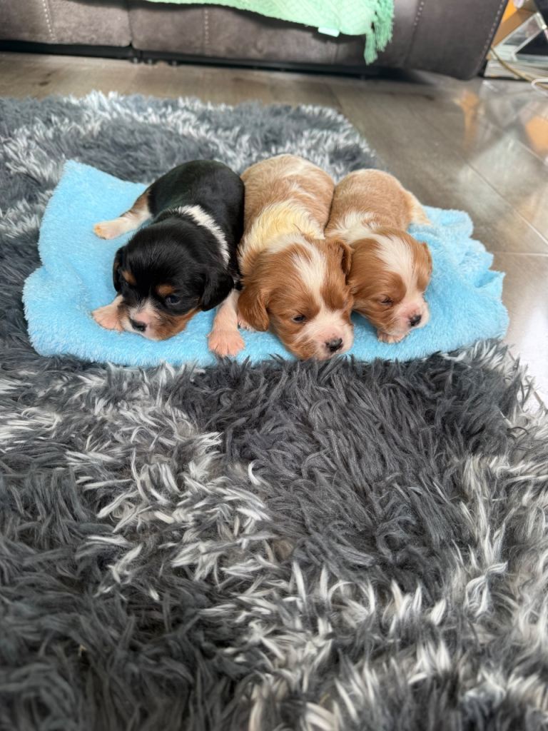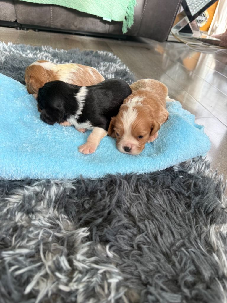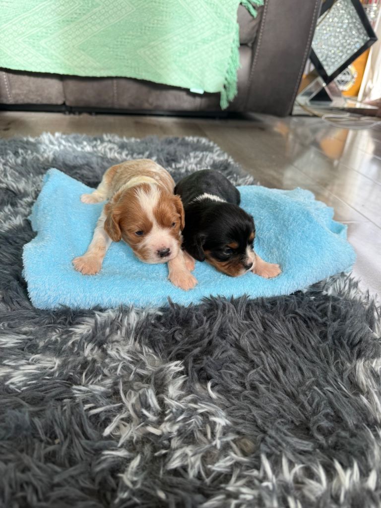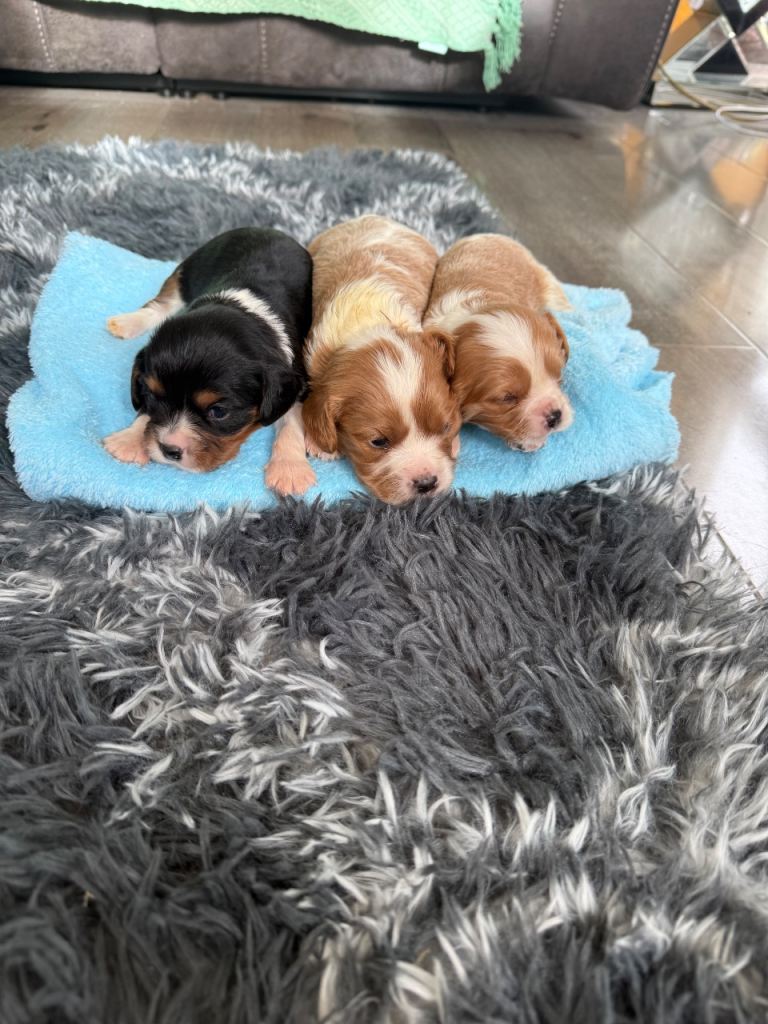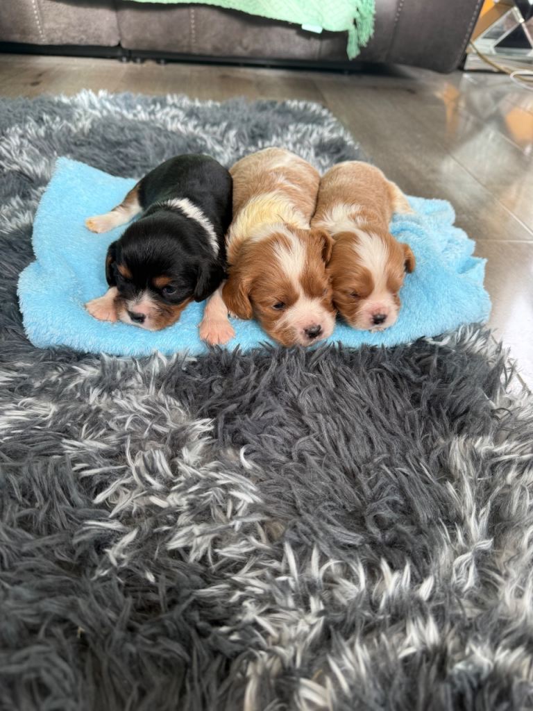 6 beautiful King Charles puppies 2 little girl 4 boys will be wormed and flee microchip well leave with blanket with mum sent mum and dad can be seen with puppies no time wasting genuine interest only love homes £200 nonrefundabledeposit to secure 2 girl reserved one boy reserved just 3 boys left 2 Belgium one tri