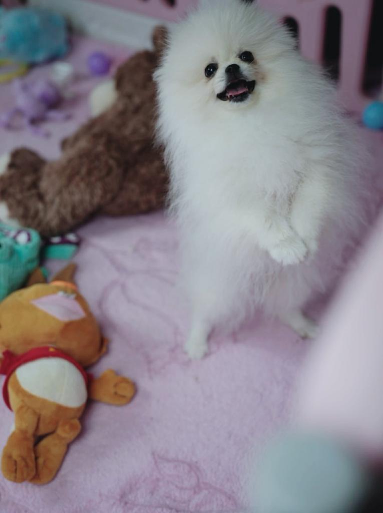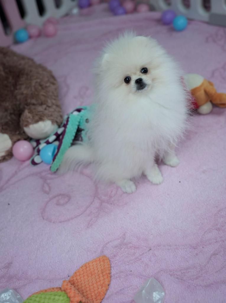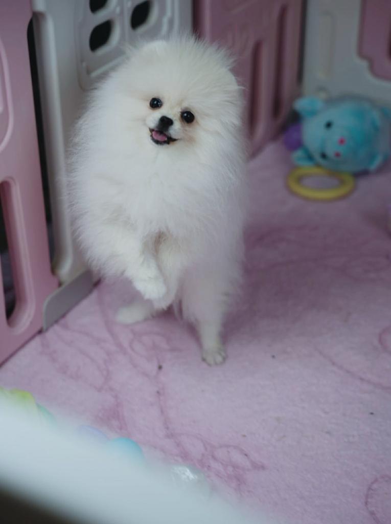We have a beautiful and very special white Pomeranian puppy looking for her forever home. She is a friendly, cheerful and energetic little girl with a lovely personality.