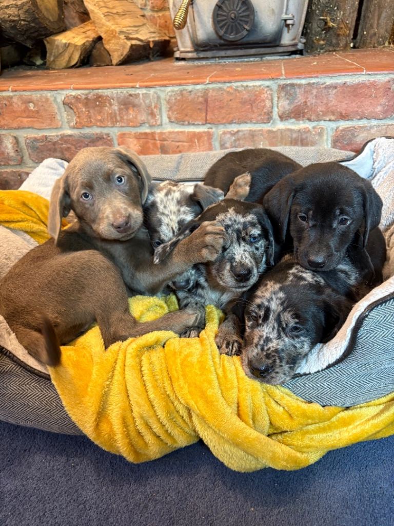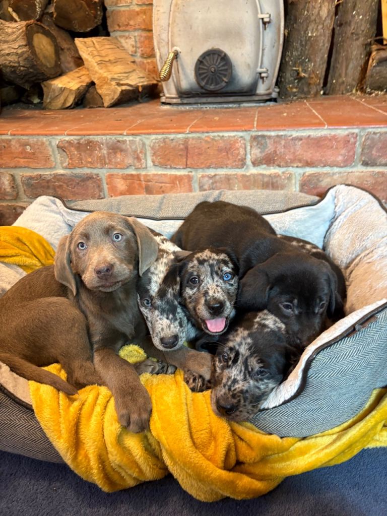 Dad is a handsome Merle Labrador, with renowned temperament to match his wonderful colouring. Holly is a stunning black Labrador, an exceptionally versatile dog both a working Labrador and family pet. Both parents’ have lineage with excellent health scores.