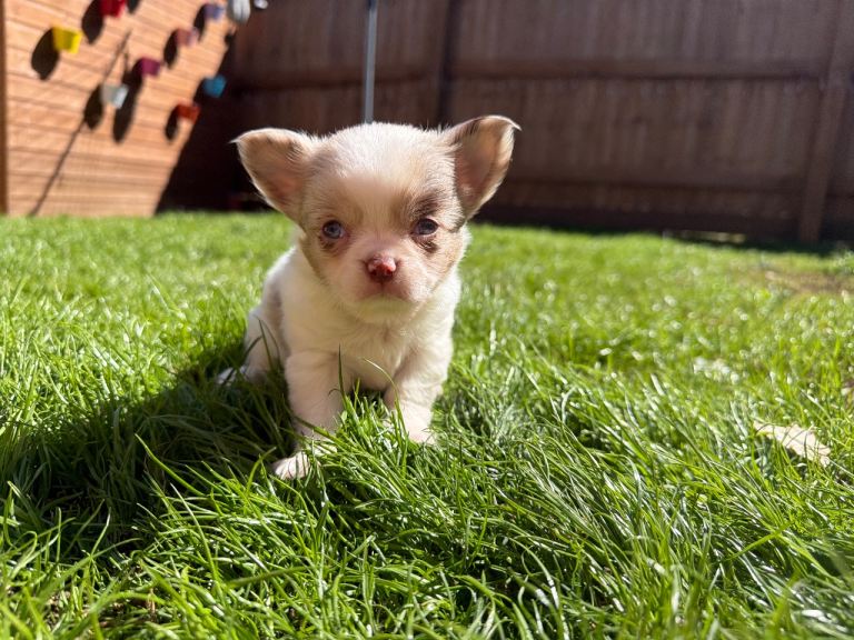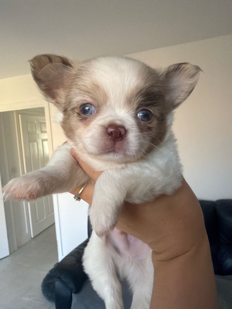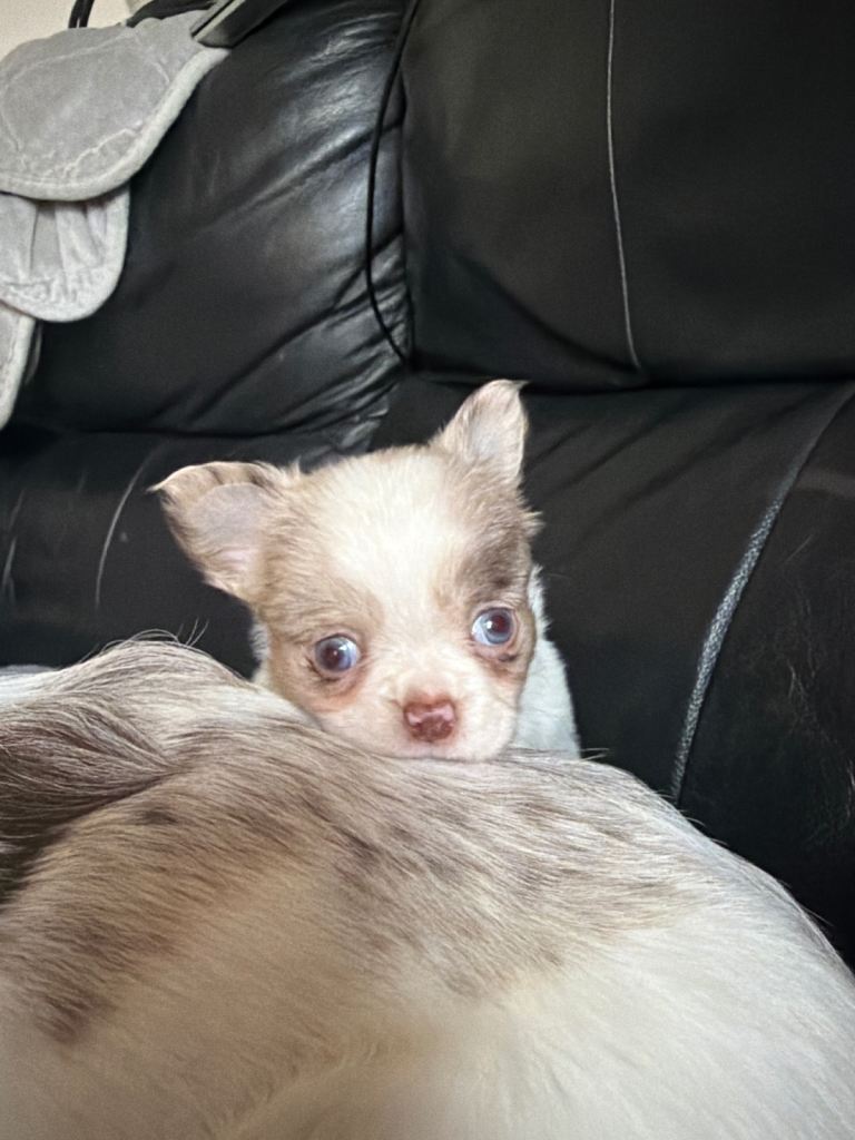 One super cuddly male long hair parti chihuahua with green/blue eyes. Was in a litter of 4.