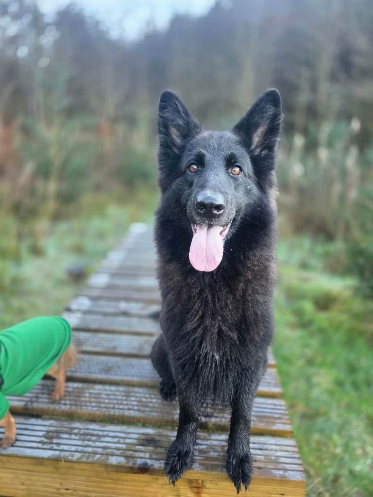 shes needs someone with time and attention cant be left in alone shes developed separation anxiety she is very affectionate fine with other dogs house trained walks off lead recalls on point .