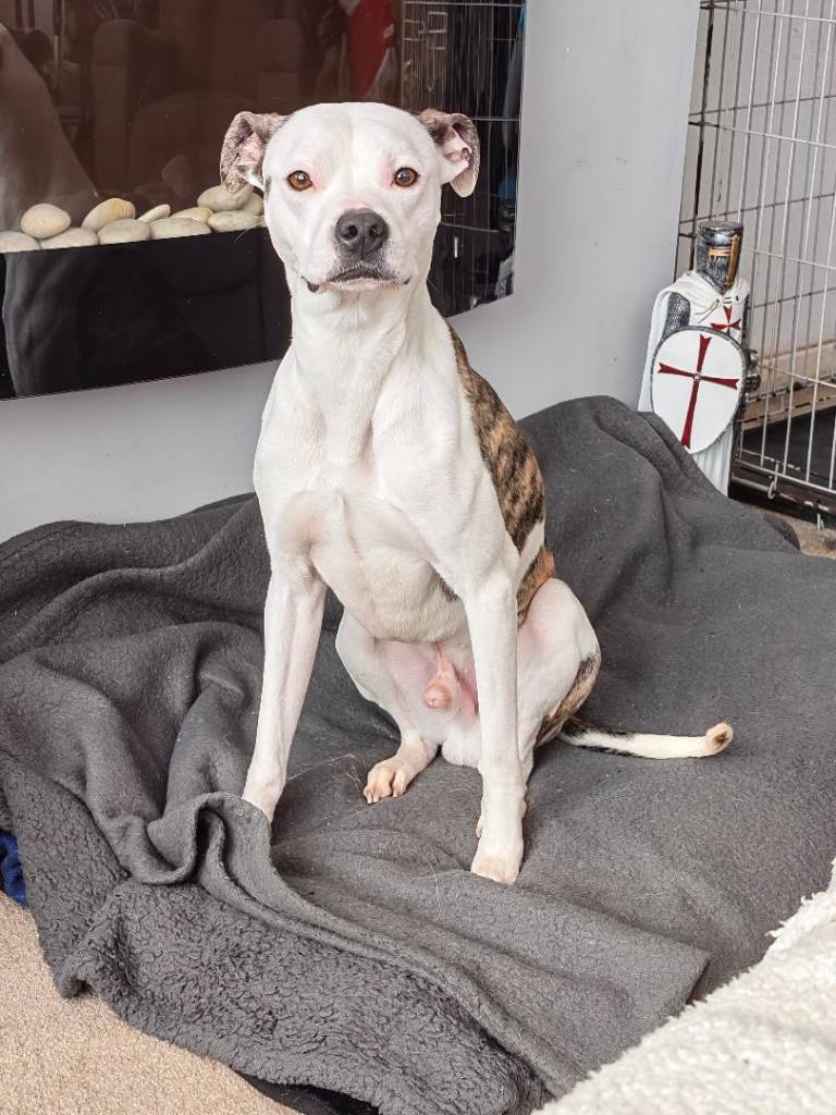 Moose was bought in November 2023, and it’s a cross Whippet Staffie. He is basically a cat in a dogs body. He would gladly sit on your lap or next to you, under a blanket all night long. He is a typical Staffie as he can whine, but he is loving and gentle. He has what we call a “princess bottom” prefers to sit on Bear or a blanket instead of his butt on the cold floor. Lol