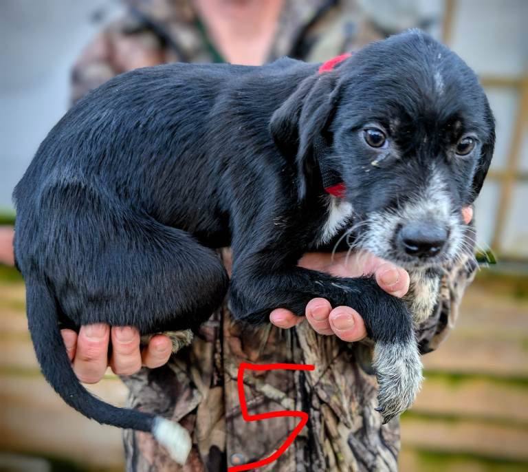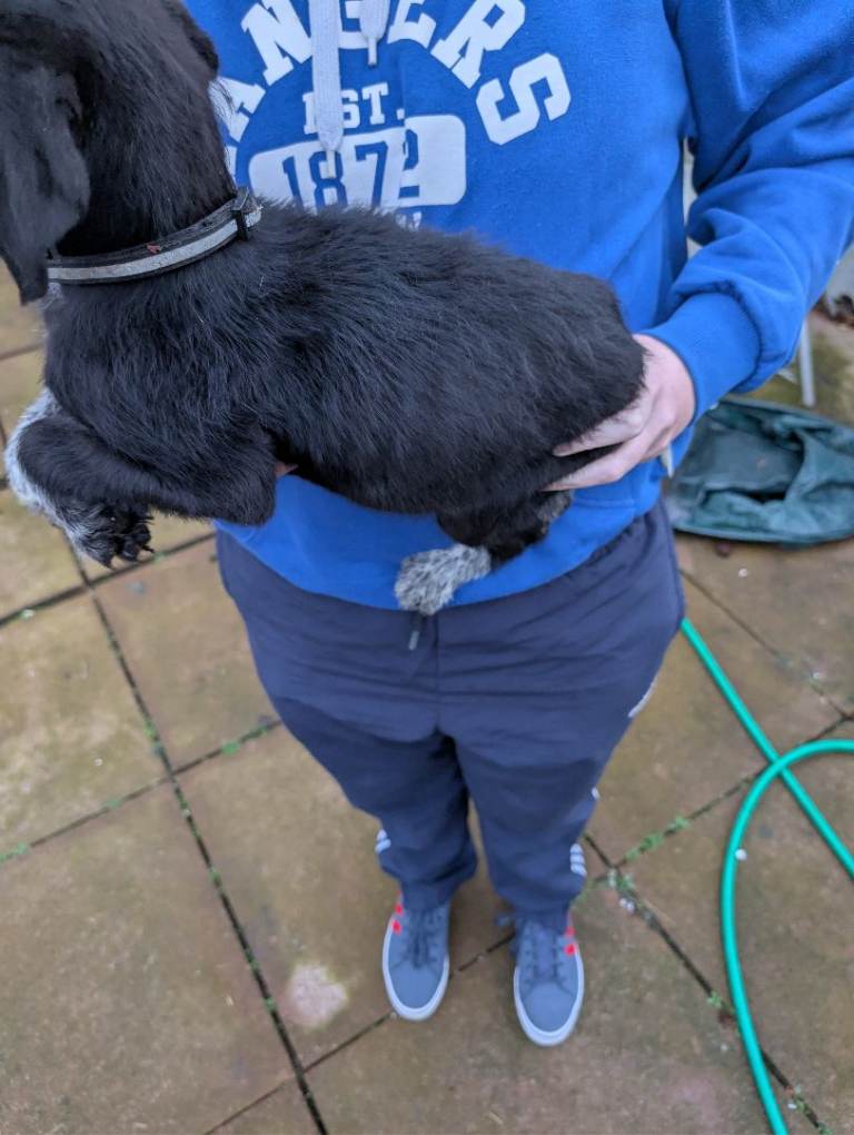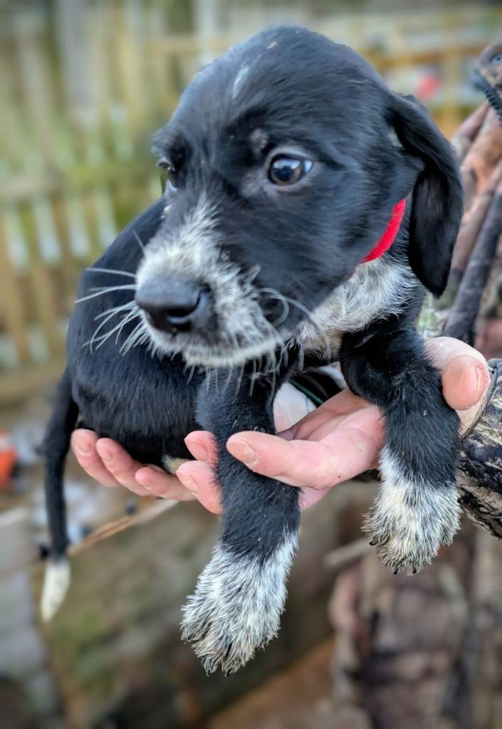 Bitch Black With White Paws and White Tip Tail & Wee White Patch on Neck.