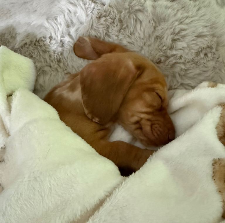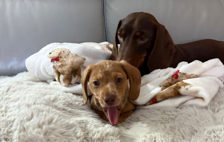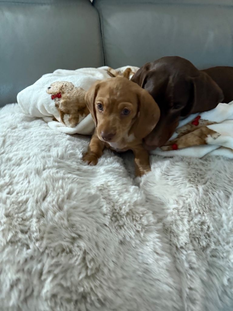 Male Minature Dachshund born 23rd October. He is red and cream dapple. He is fully vaccinated and up to date with flea and worm. He has been with us since he was 8 weeks old but unfortunately my female Dachshund will not tolerate him despite every effort. He gets on well with my male dogs and loves to play and snuggle.