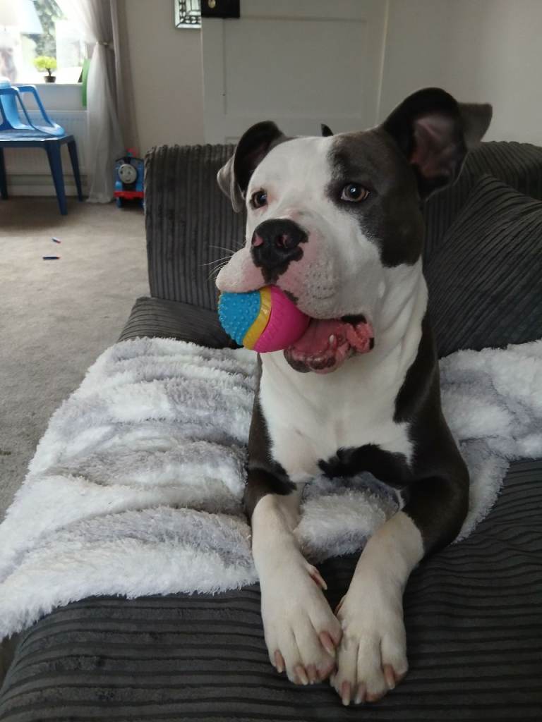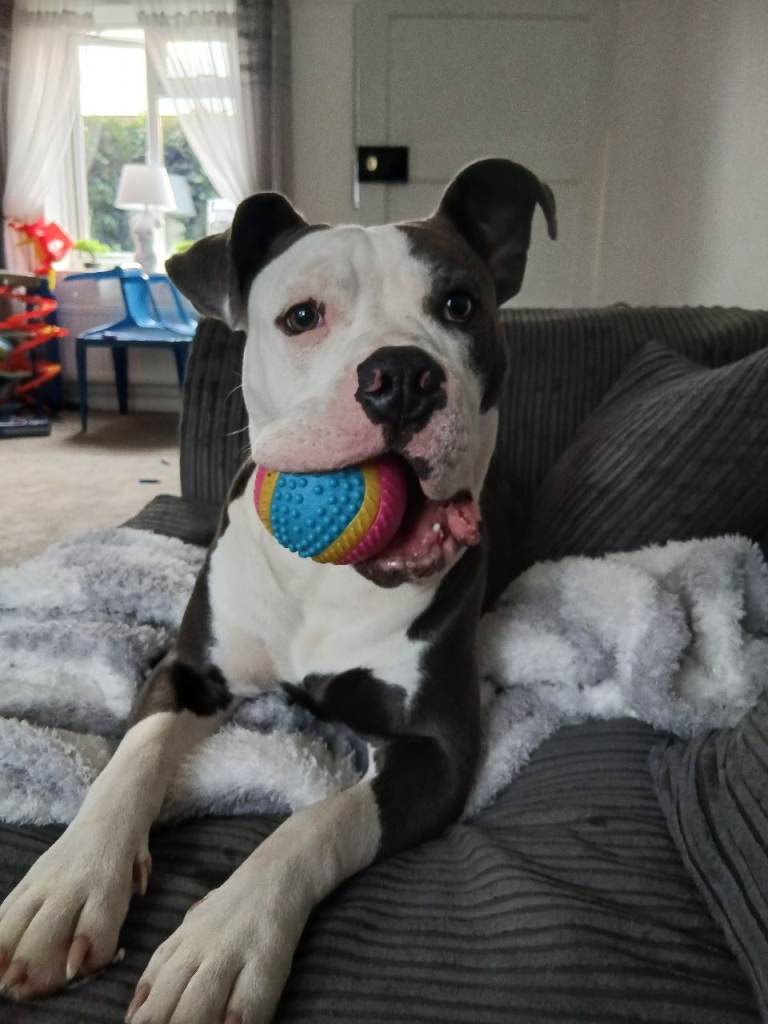 Hi. My names tilly. Im a 14 months old female. I have a temporary home at the moment as my old owners have moved country and couldn't take me with them. I am really playful and I get so excited I jump up people. I absolutely love playing with a ball and squeaky toys. I like to eat carrots and broccoli raw.