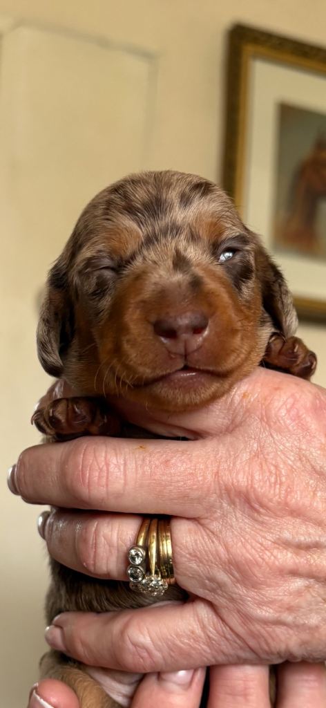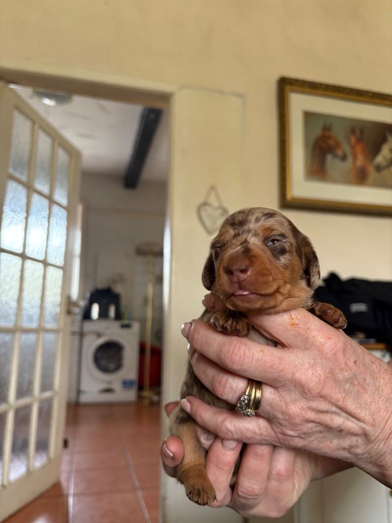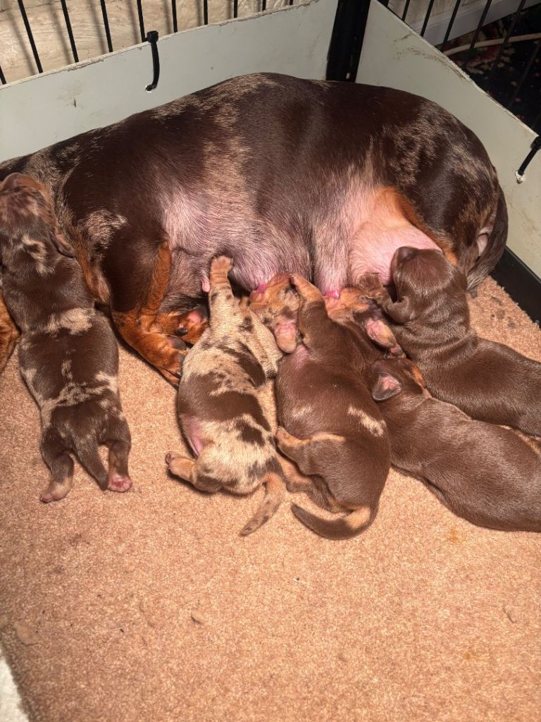 We have three stunning mini dashounds girls one chocolate dapple and two chocolate and tans will be chipped wormed they are seen with my Bella mum best friend ever great with kids very tiny dire is 3 kilo must be seen