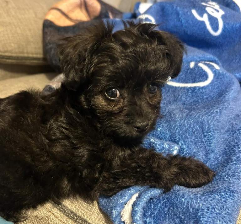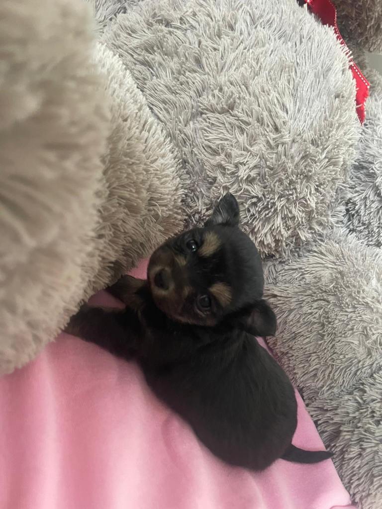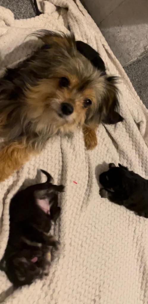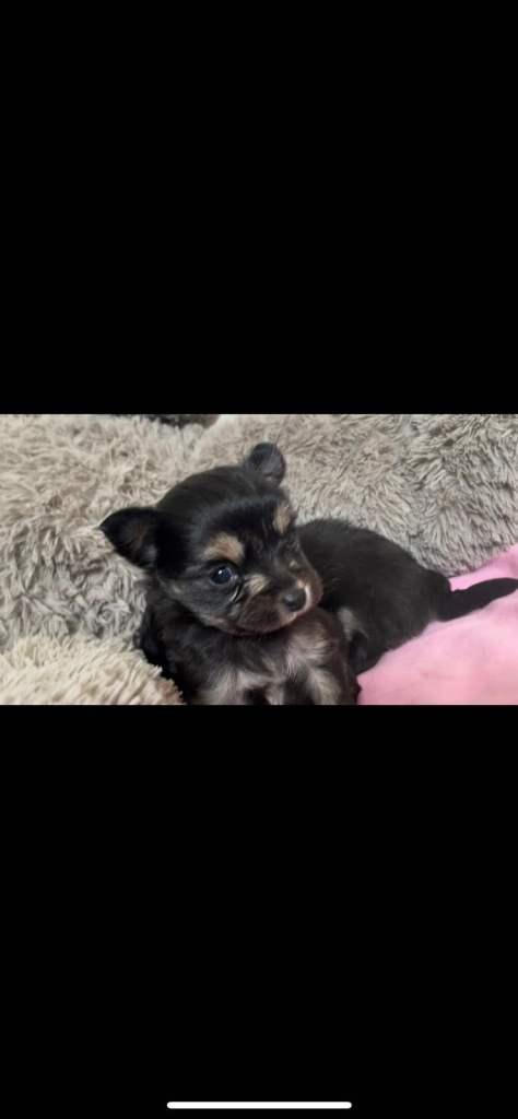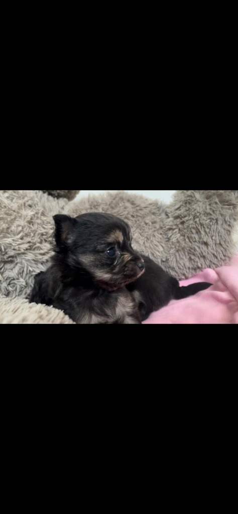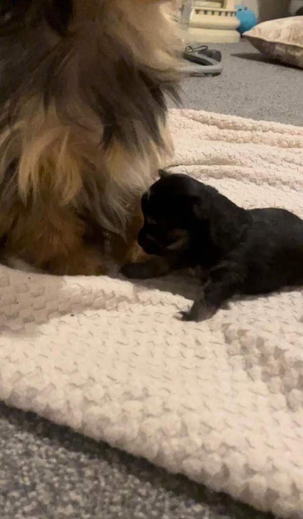 My beautiful dog Bella has had a litter of 4 gorgeous puppies mum is 3 quarters Pomeranian 1 quarter Yorkshire terrier dad is full Pomeranian . Puppies are long haired and black and blue/grey in colour 1 male 3 female male is the smallest both mum and dad are small dad weight 8/9lbs mum 10/11lbs both are healthy .