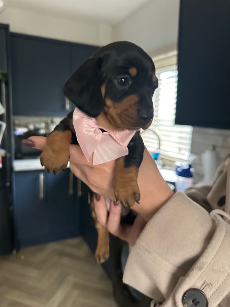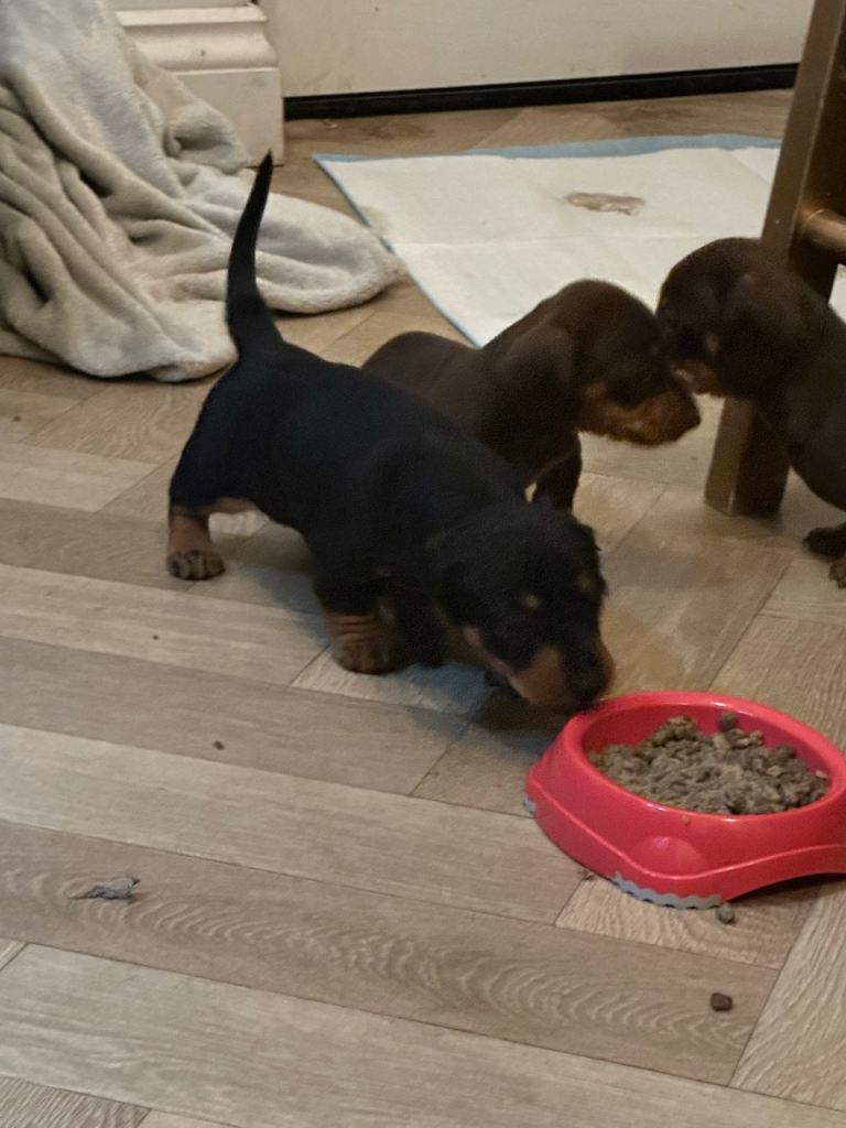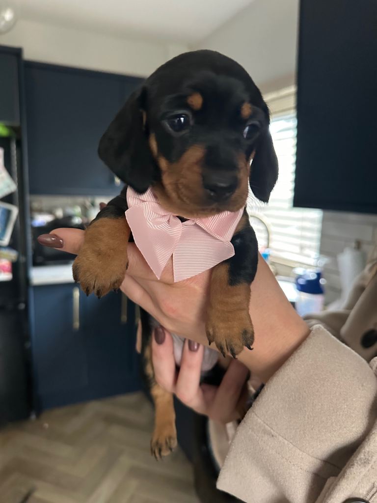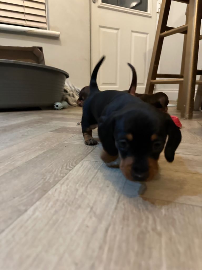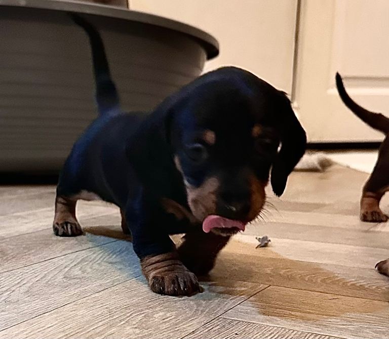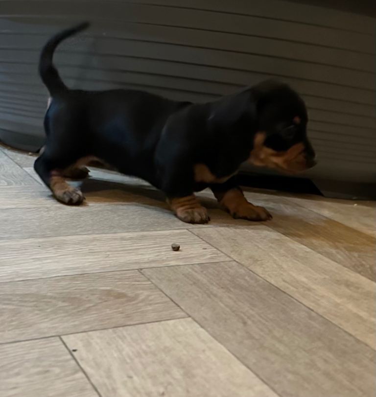 I am thrilled to introduce a stunning Black and Tan KC Registered Miniature Dachshund puppy from exceptional champion bloodlines. This puppy is in great health, lovely temperament, and has quality conformation, making it the perfect companion.