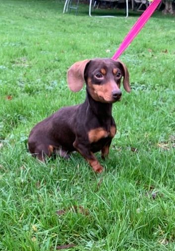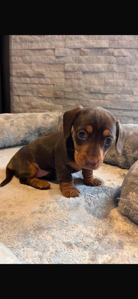 Miniature Dachshund puppies ready for their new forever homes but prepared to hold.