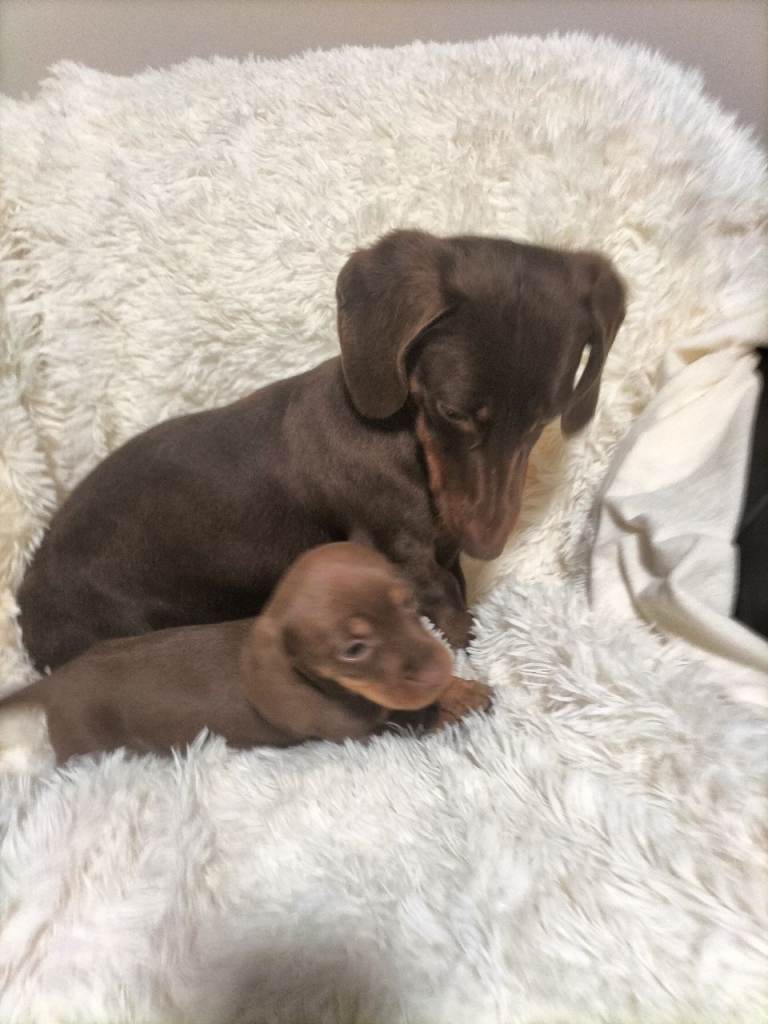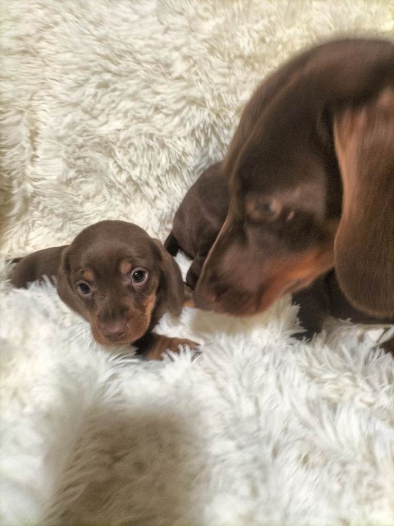 Wee dachshund male puppy chocolate n tan, Beautiful little boy full bred great example of the breed, full of beans and ready to go, he was eight weeks old 18th of January last Wednesday, I own both parents they are with him in the photo's, dad is choc n tan mum is new shade Isabella, will come with full vet card first vaccination and microchip, Must state that these little guys are to be kept indoors, they can't stand the cold.