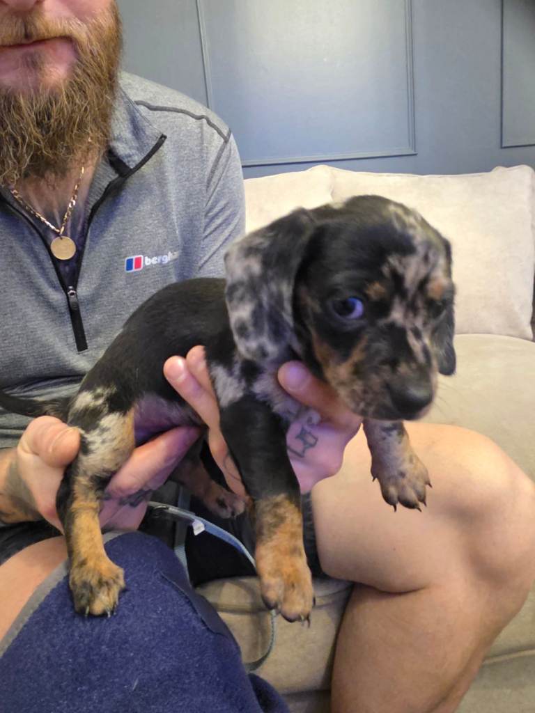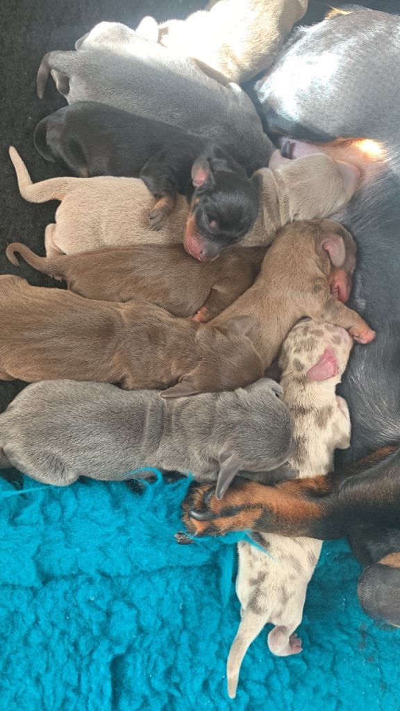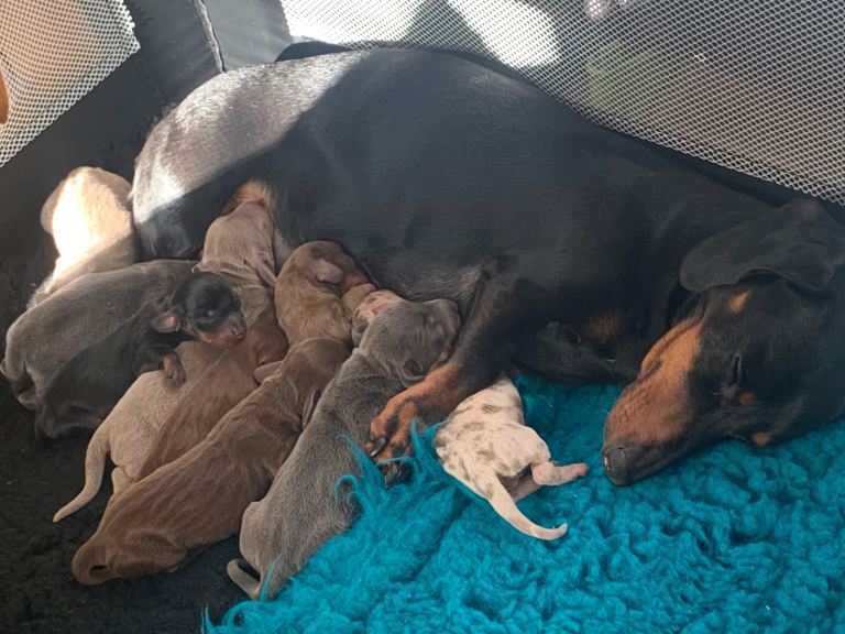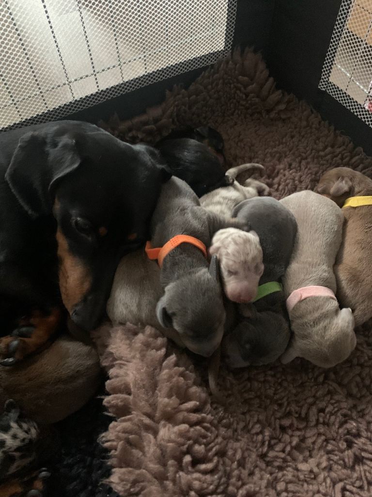 Seven boys, three girls. 1 black & tan boy 2 chocolate & tan girls 2 blue & tan boys 2 Isabella & tan boys 1 Isabella Dapple boy 1 silver dapple girl (reserved) 1 chocolate & tan boy Both mum and dad vet health checked, KC registered Mum is my beloved and good natured girl (black & tan) Dad was a beautiful and gentle stud (Isabella) All will be handled often, used to noises, KC registered, chipped, wormed, vet checked etc Any questions please ask. Dapples and girls slightly more (£1500)