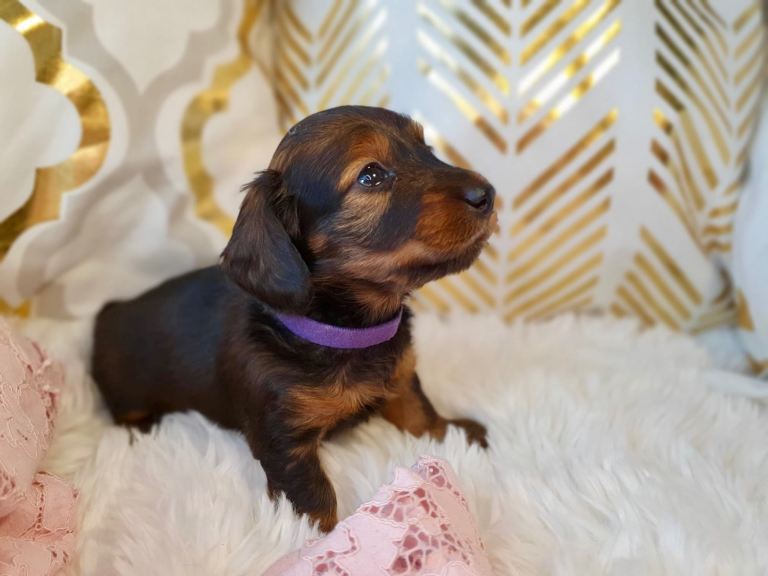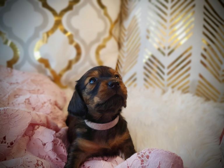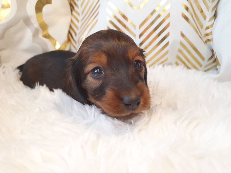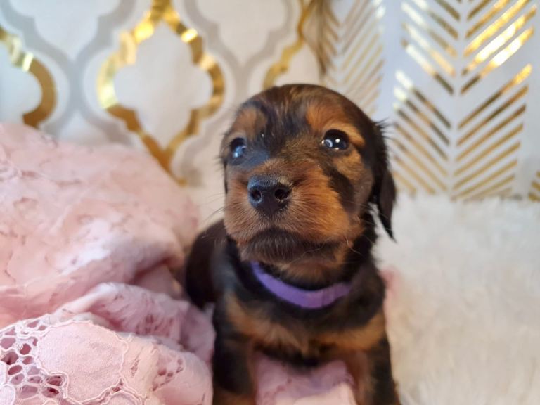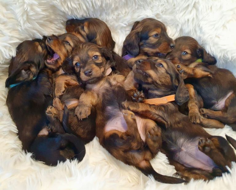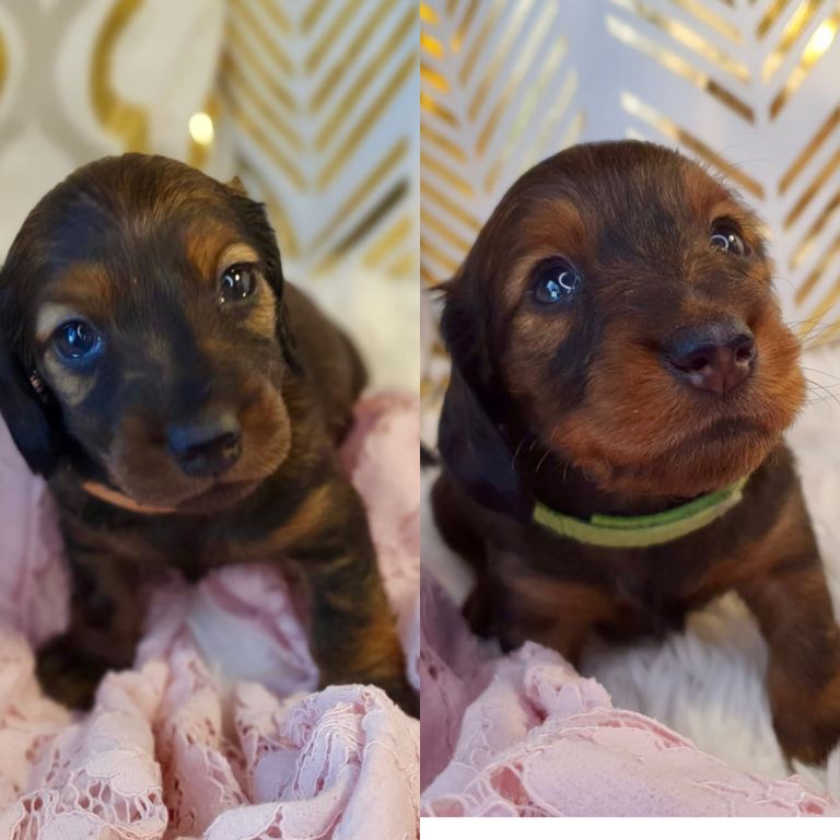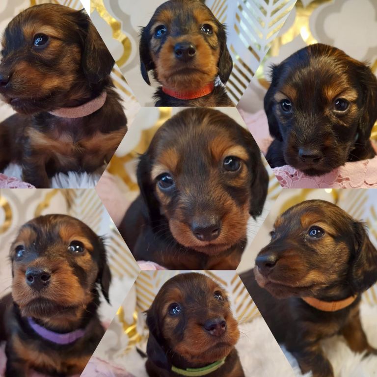 We are delighted to offer a lovely litter of 7 Dachshund puppies — 5 girls and 2 boys, all in stunning shaded red colour. Date of birth: 13th March 📍 Ready to leave at the appropriate age Both parents are Kennel Club registered, with excellent temperament and true-to-type features. ✔️ Puppies can be viewed with their mother ✔️ Raised in a loving home environment ✔️ Well socialised and used to everyday household noises Before leaving, each puppy will be: Wormed regularly Microchipped Vaccinated Puppies GREEN COLLAR BOY- Reserved RED COLLAR GIRL -available BLUE COLLAR BOY -available PURPLE COLLAR GIRL -available ORANGE COLLAR GIRL - reserved PINK COLLAR GIRL -availble WHITE COLLAR GIRL -reserved These puppies have been given the best start in life and will make perfect family companions