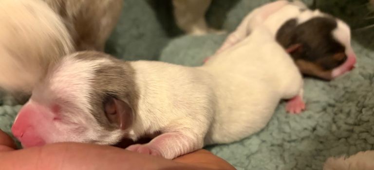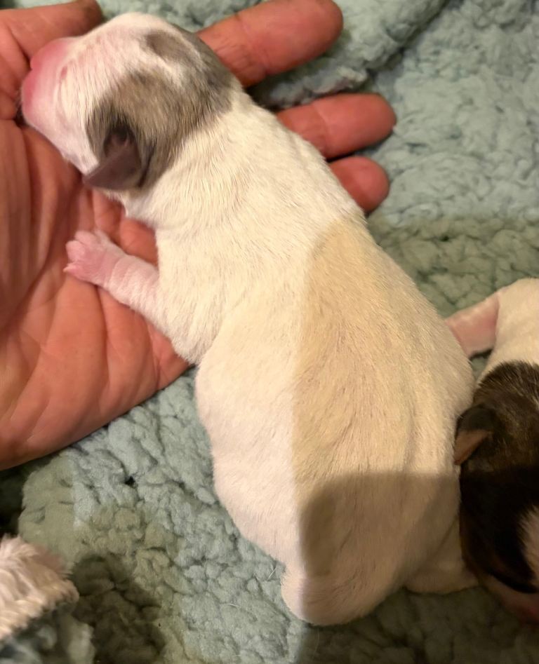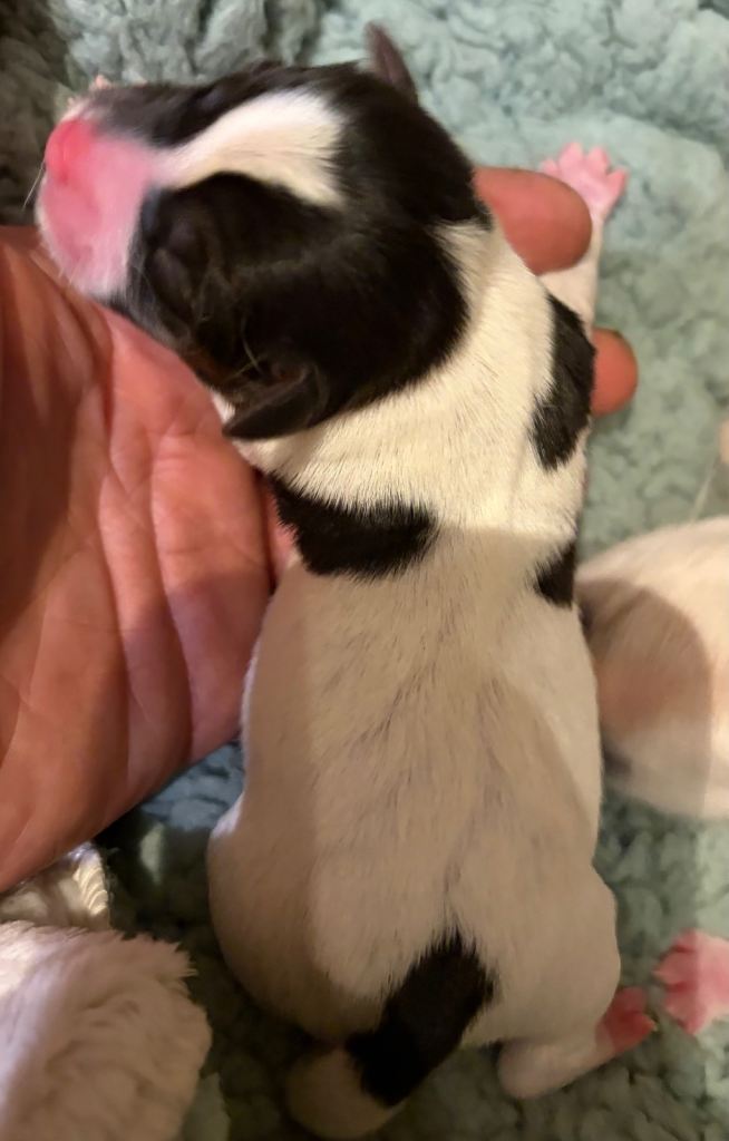 We have 2 trim-coloured boys, one silver merle boy and one with a chocolate brown ear.