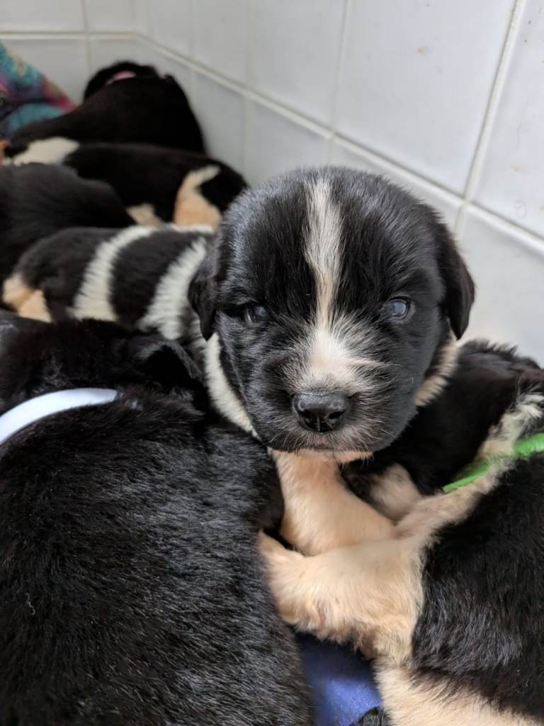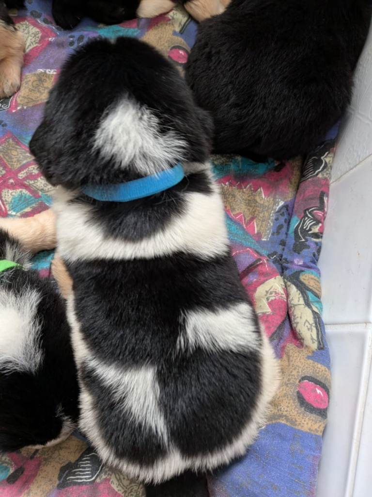 We have 3 females (All black, white spot on chest) and 4 males available (black and white)