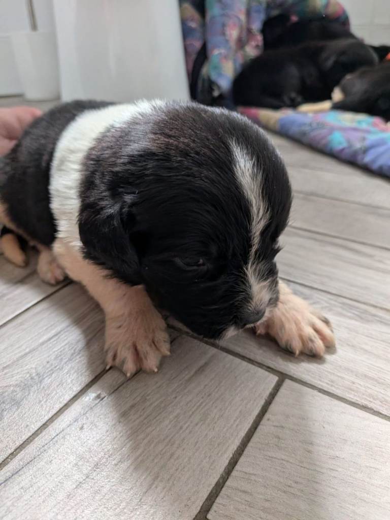 Both mother and father are our family pets, mum Luna is fully brown, her lineage is Irish, dad Tom Tom is black and white with some lovely white speckled legs and tail, his grandparents were kennel club registered in England. Happy to send through their Pedigrees upon request. Great examples of the breed.