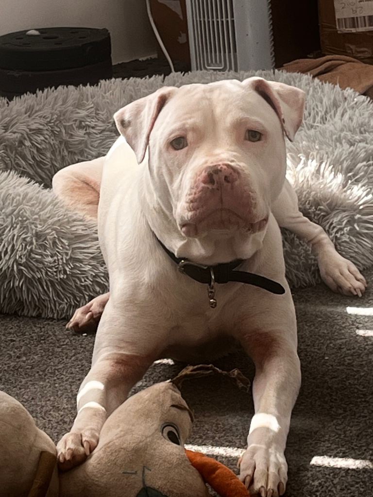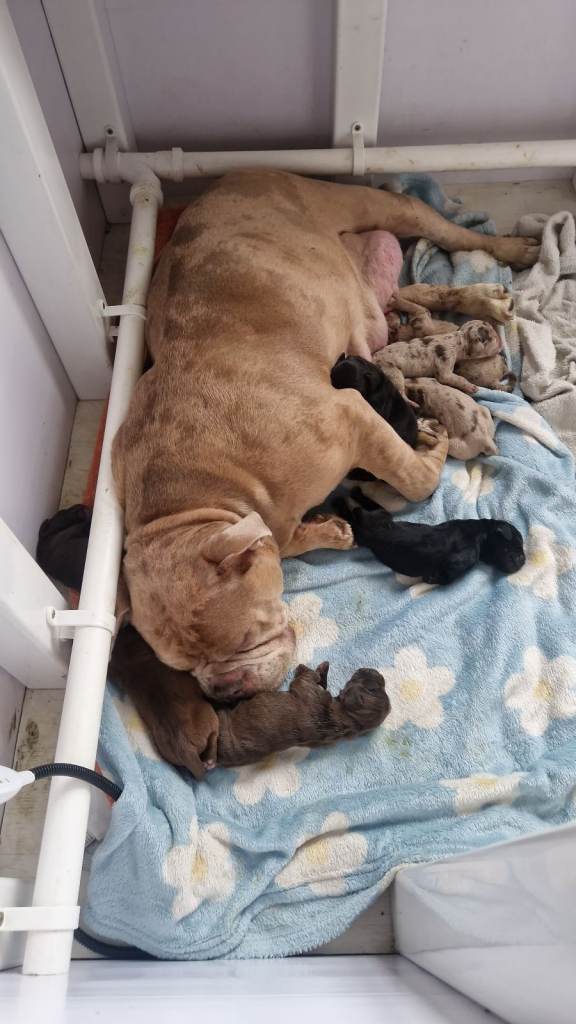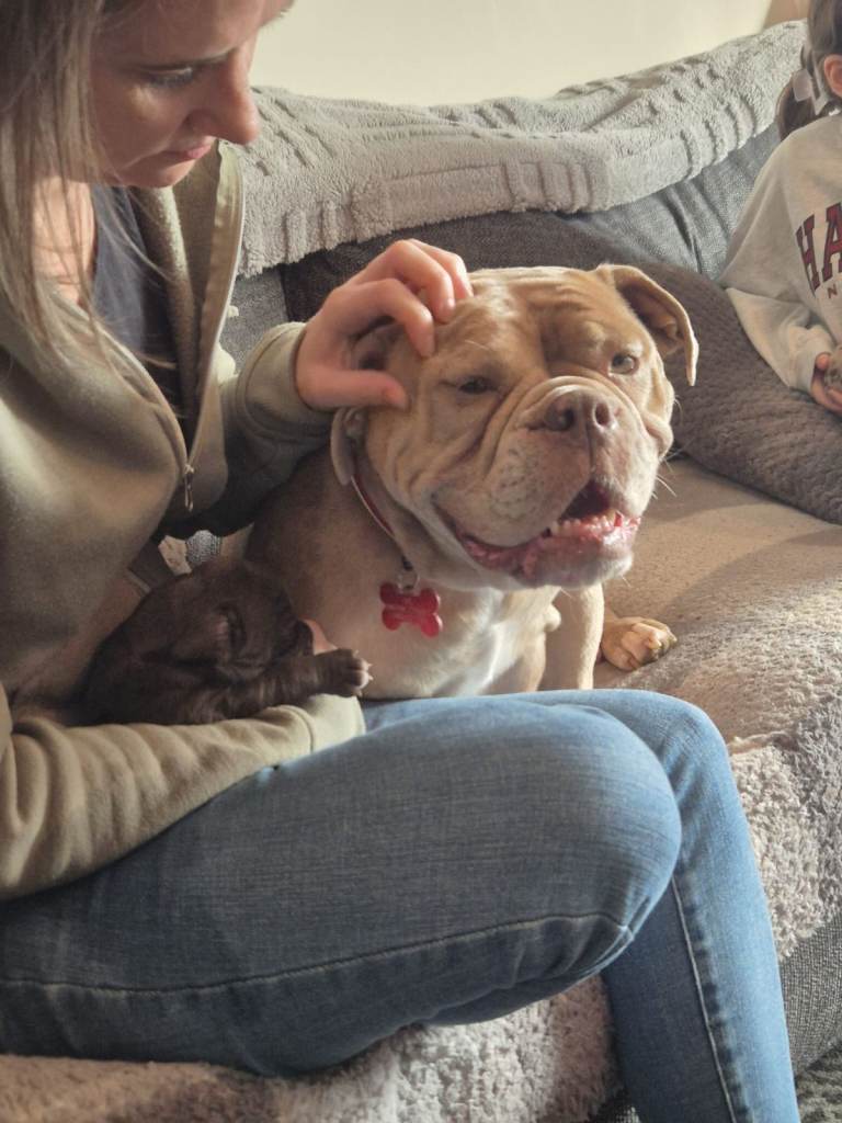 Luna the mum being an old english bulldog benefits from long legs and snout meaning she breaths better and like long walk in the countryside as well as still having the chilled lazy side at home while snuggling on the sofa