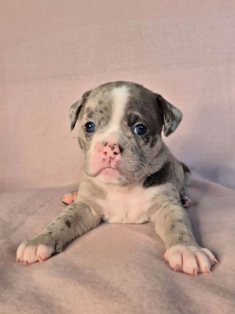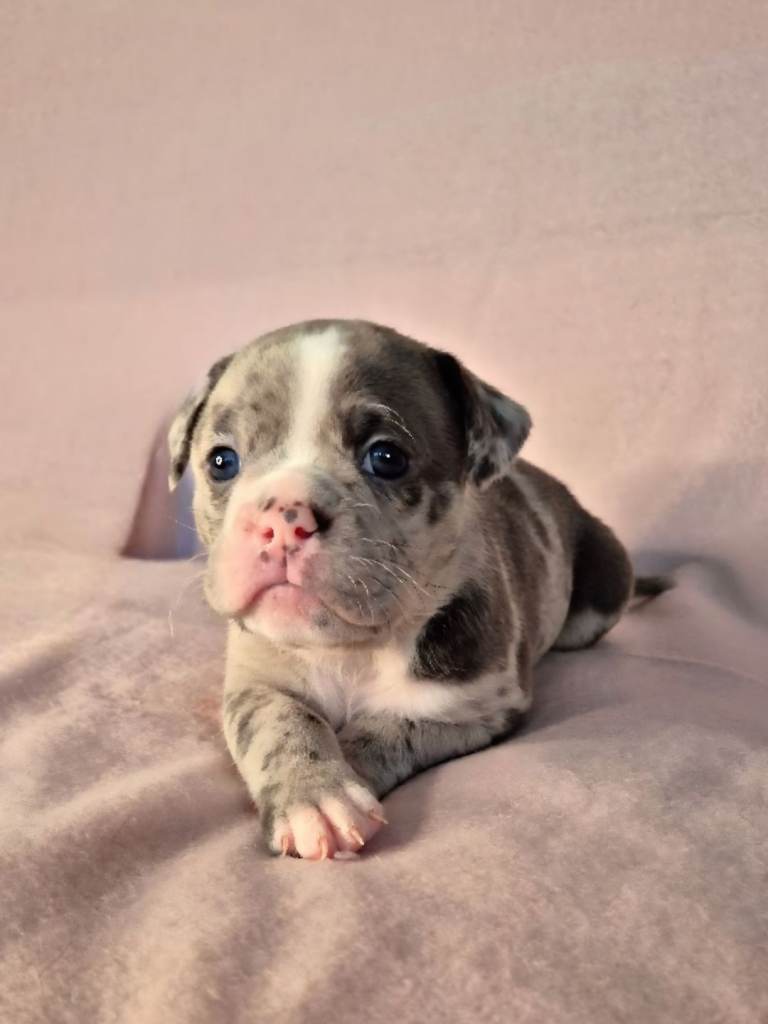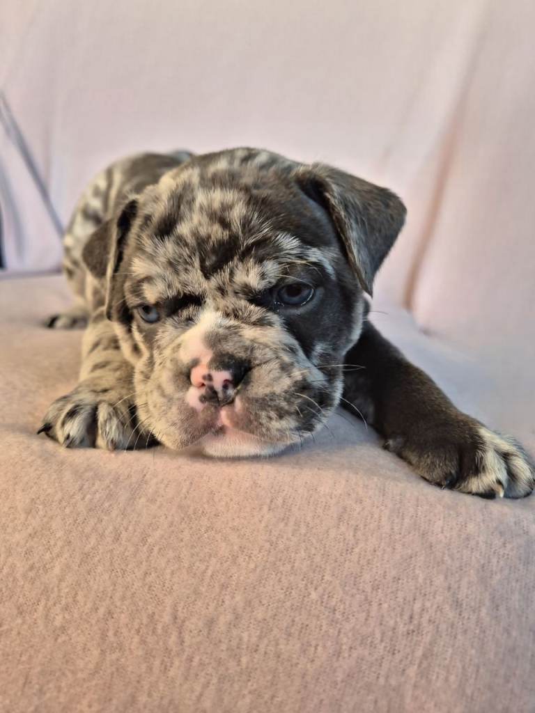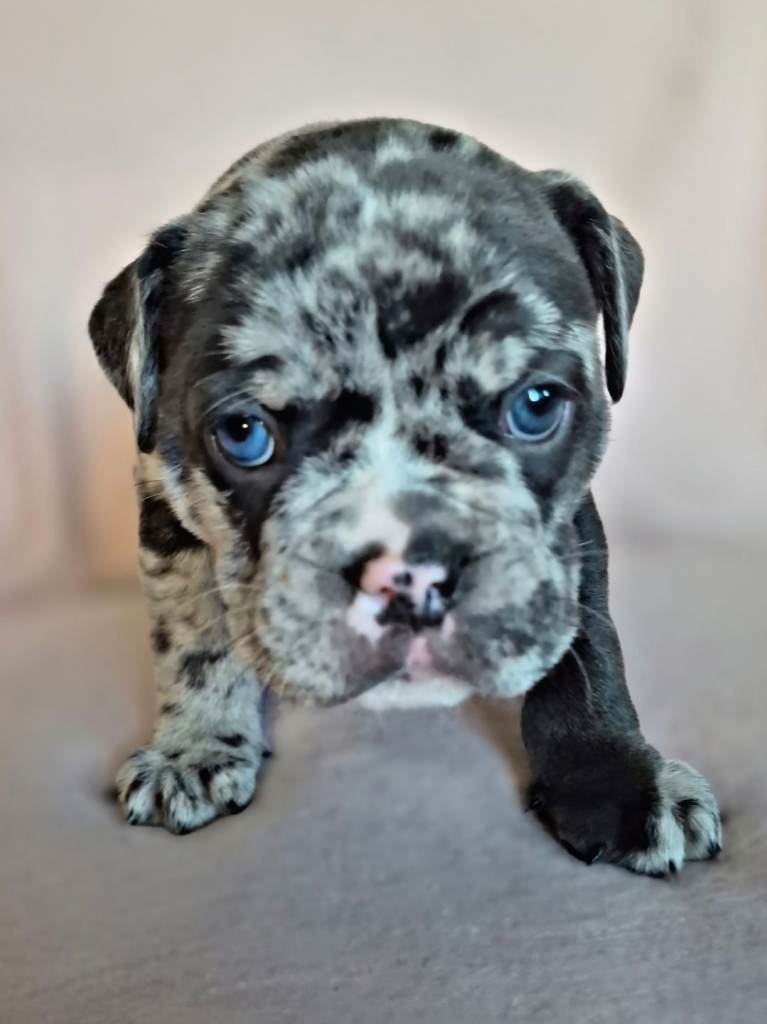 Mum, Maggie (4 years old) – Blue Merle Olde English Bulldogge, first and only litter, gentle and family-oriented, raised around kids and our cat.
