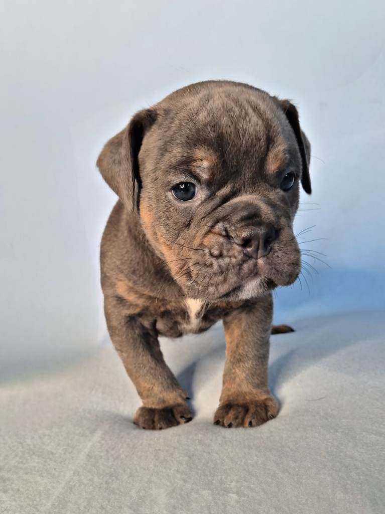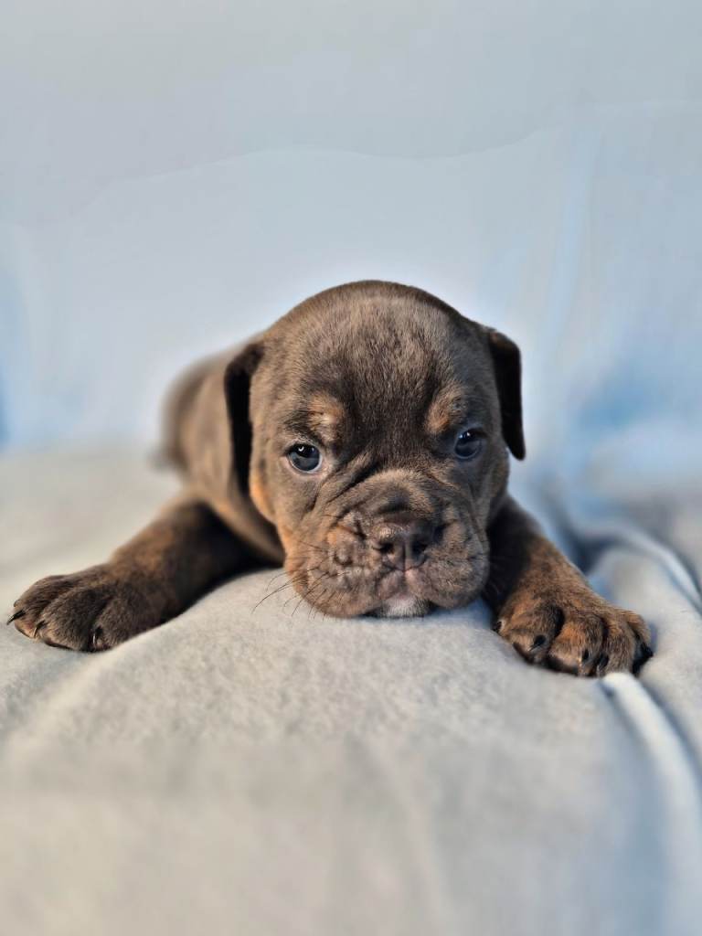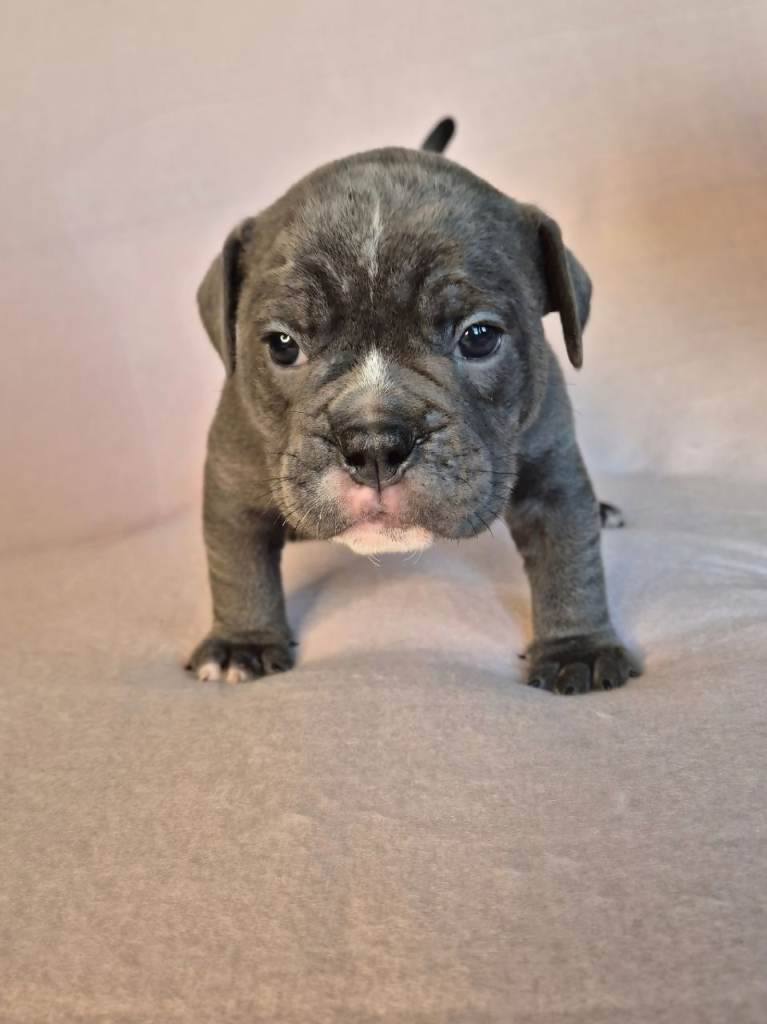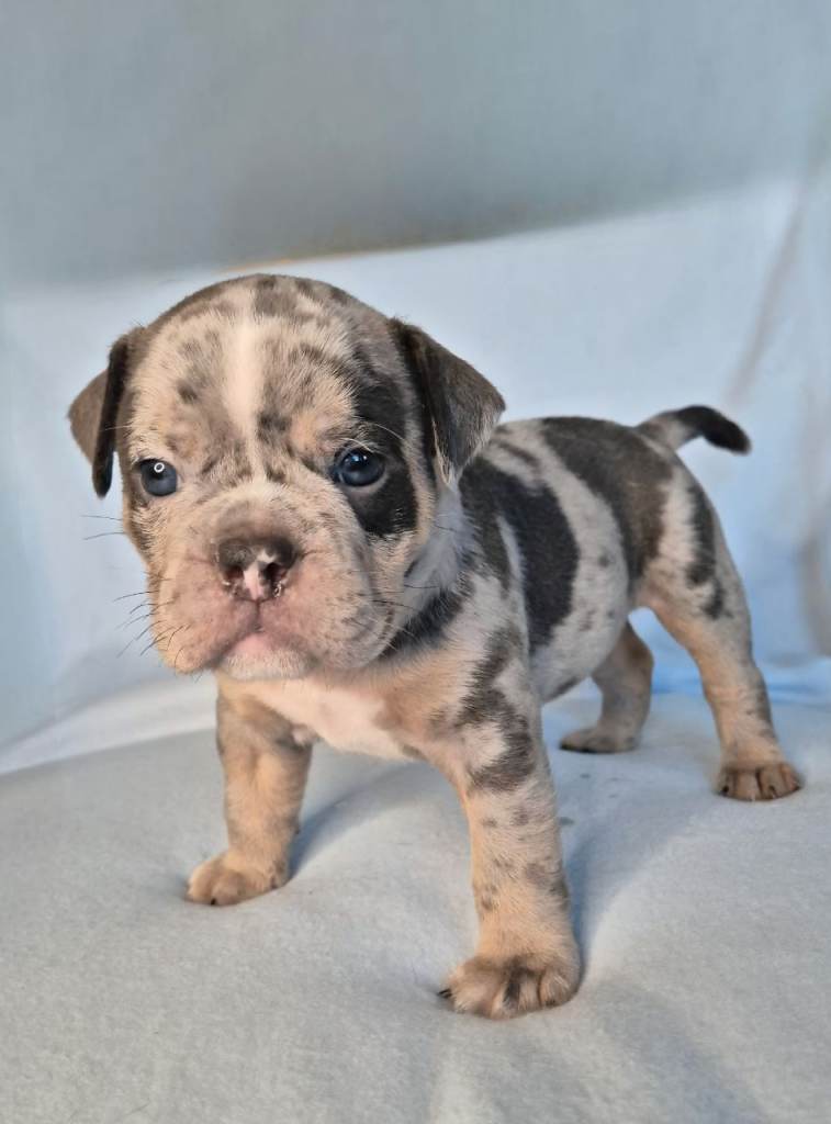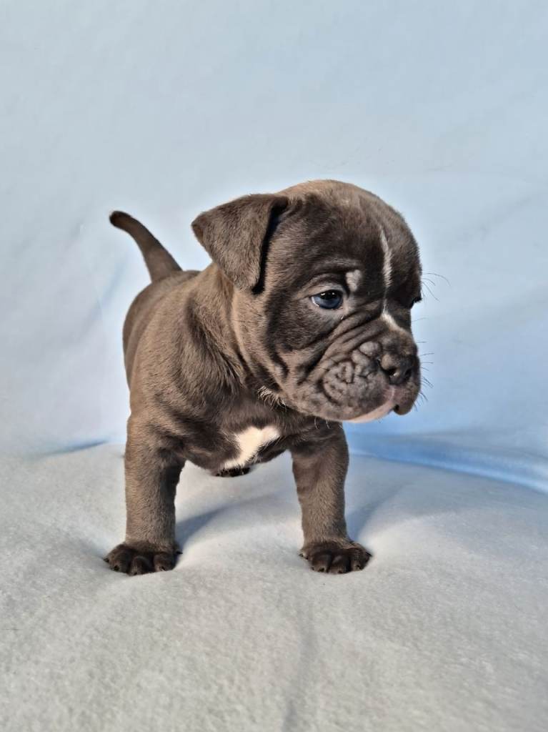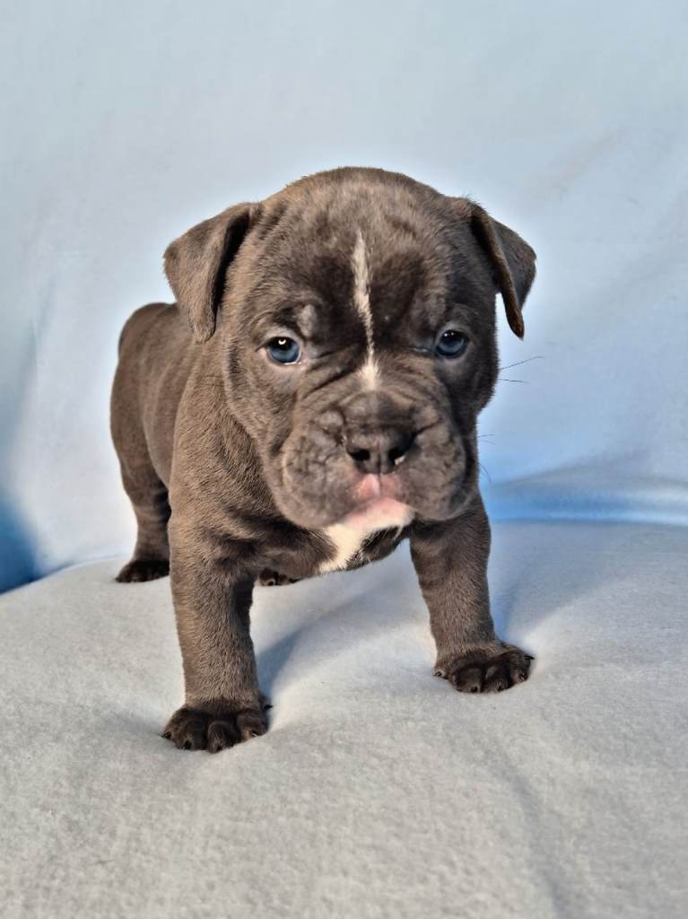 Sire, Chase – Blue Tri Olde English Bulldogge, lovely nature, solid structure.
