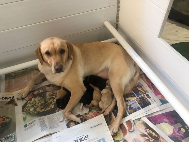 Our family pet, Daisy has had a litter of 6 beautiful yellow and black puppies. Both parents are KC registered and health tested with outstanding hip and elbow scores (Sire 0-0). The puppies have been carefully bred for their gentle, obedient, friendly temperaments and smaller working Labrador frame. Daisy is our much loved family pet and the sire was especially chosen for his excellent behaviour and kind, gentle nature. Both parents have outstanding pedigrees with strong field trial champion lines.