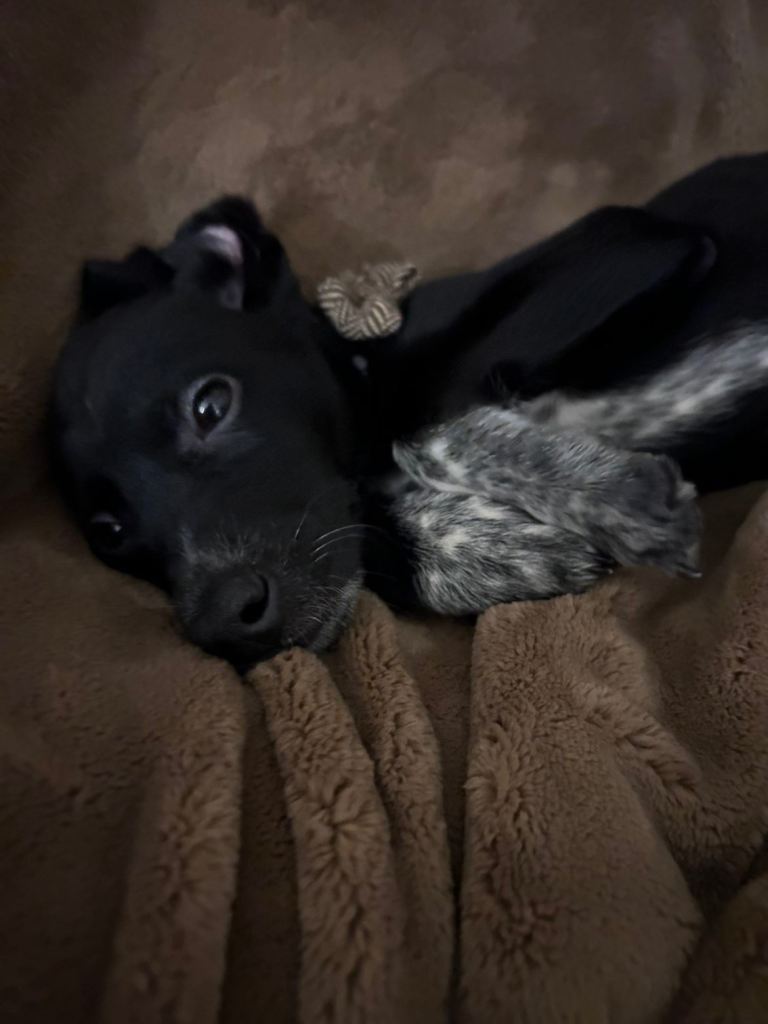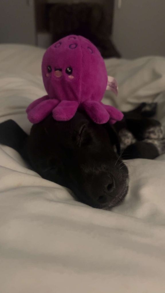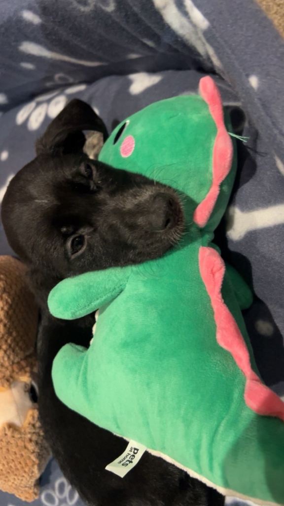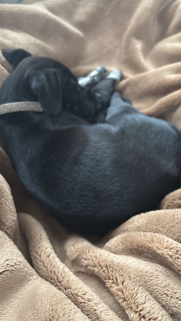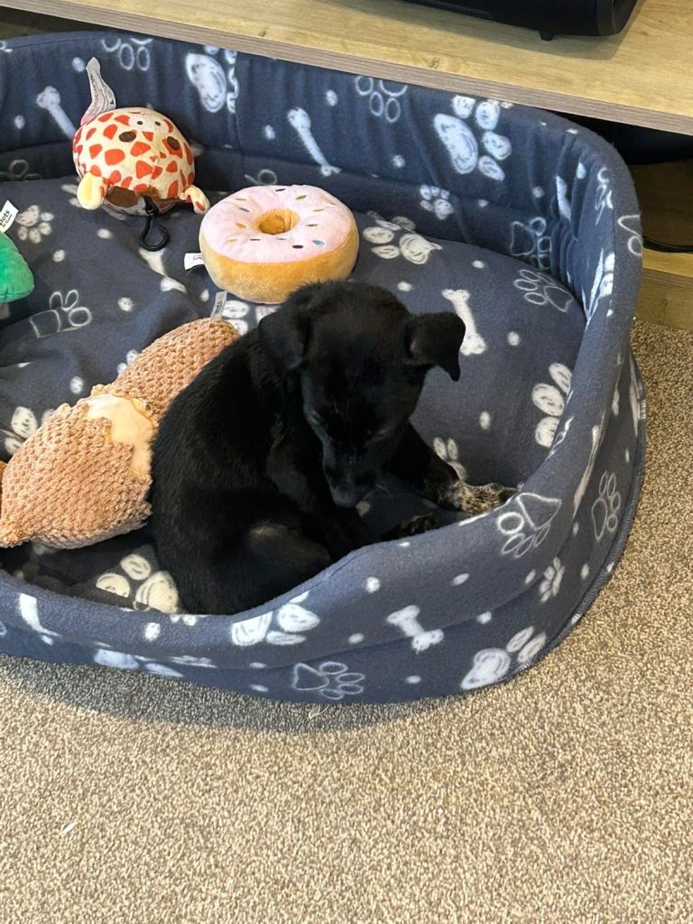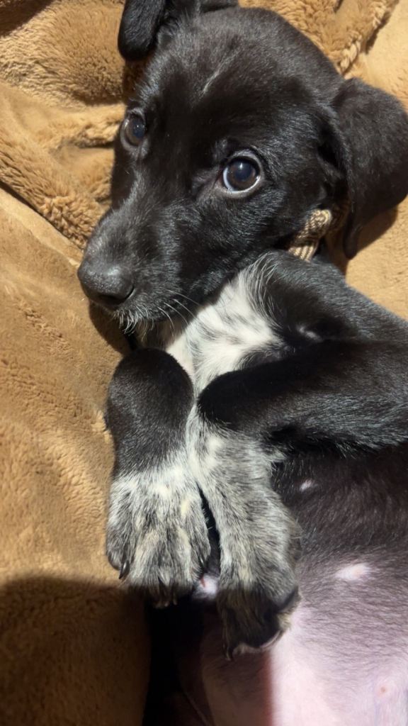 This is Lucky. She is an 11 week old Pointer X Lurcher puppy born on 7/11/25. We are having to rehome her through no fault of her own. I have discovered I am allergic to her and with me and my partners new work schedules we will not be able to give Lucky the time and attention that she deserves and needs. She has had her first set of vaccinations and is due for her seconds. She is deflead and dewormed and is completely healthy. She is a very bouncy puppy who loves to play and will also cuddle with you. She will come with her bed, toys, some food, puppy pads and her lead. I want her to go to a good home with people or a family who have time for her.