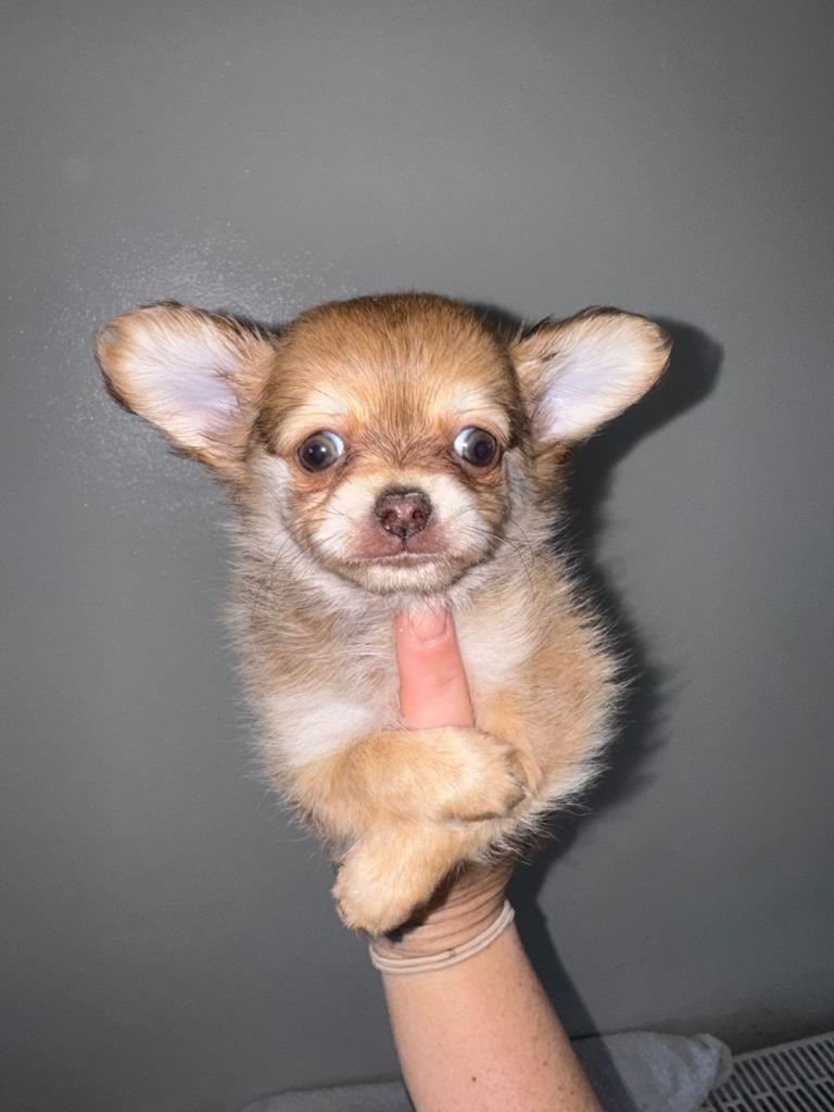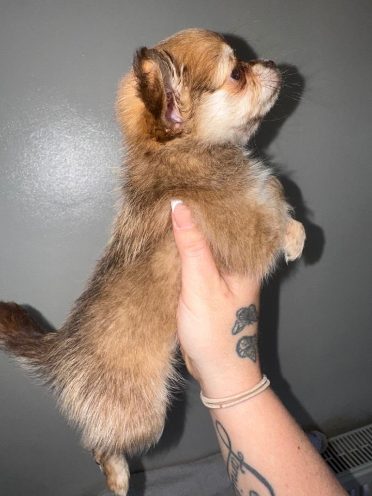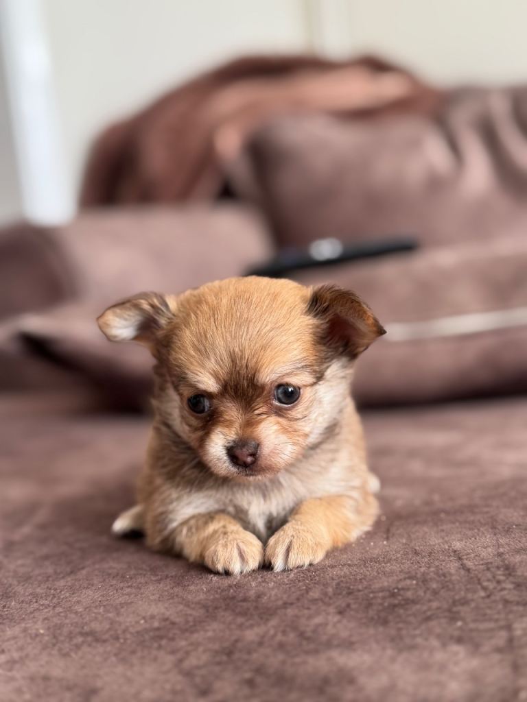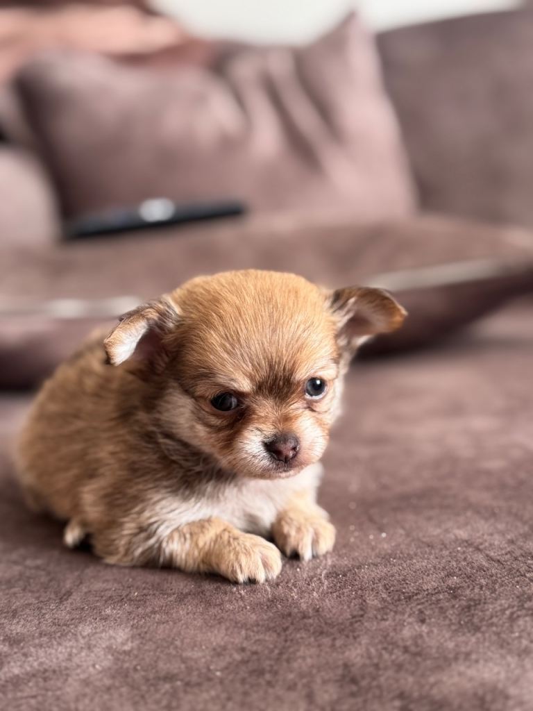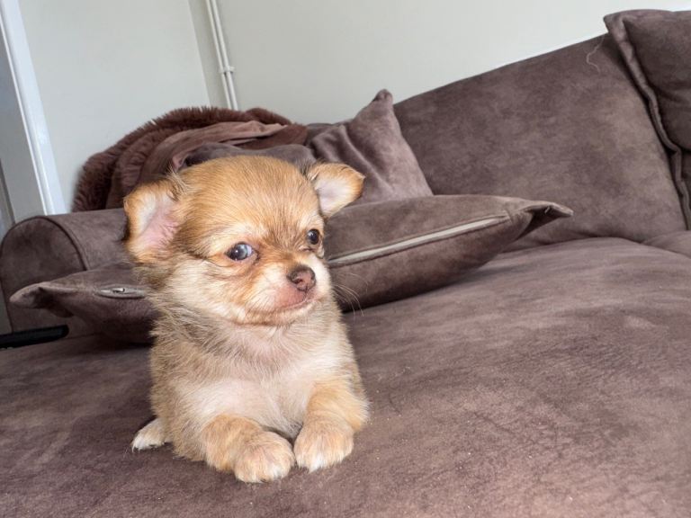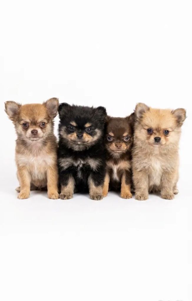 Mum is our beautiful Chihuahua and dad is our handsome Pomchi – both can be seen at home, showcasing their wonderful temperaments and affectionate nature.