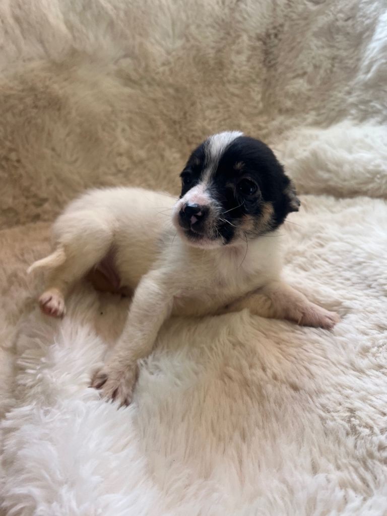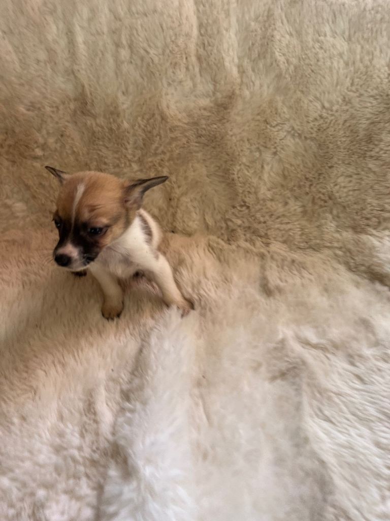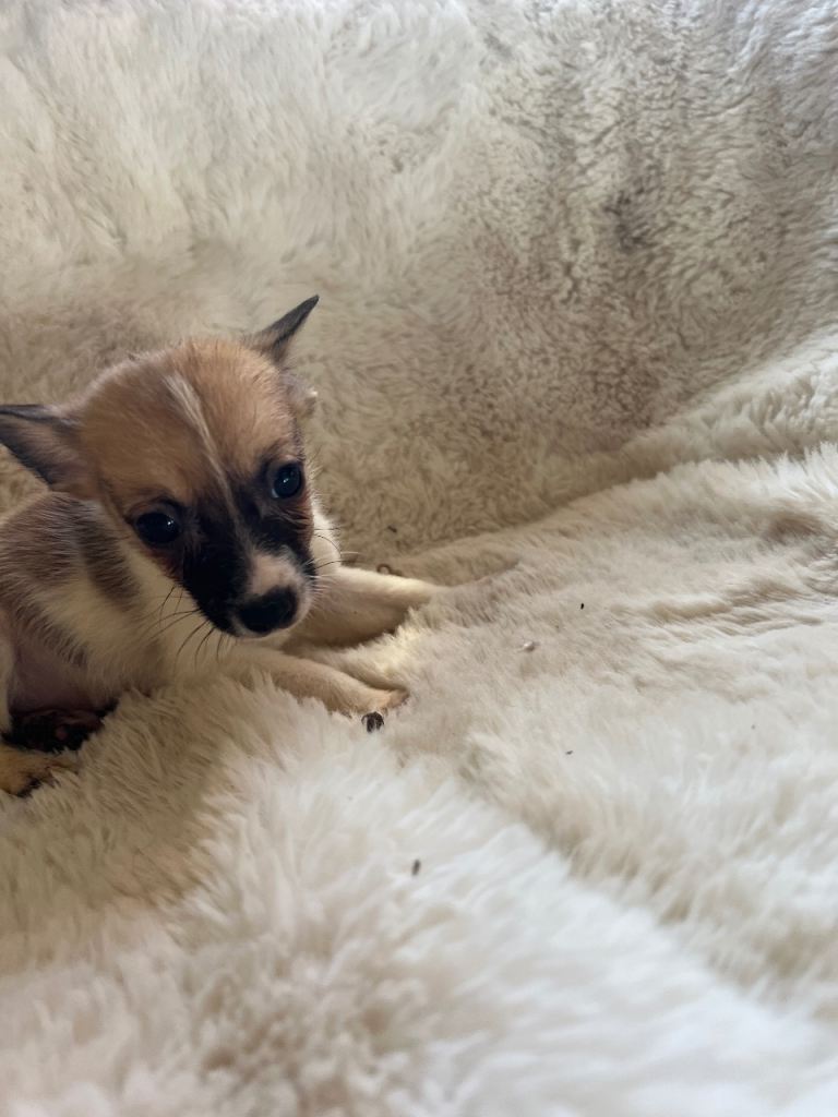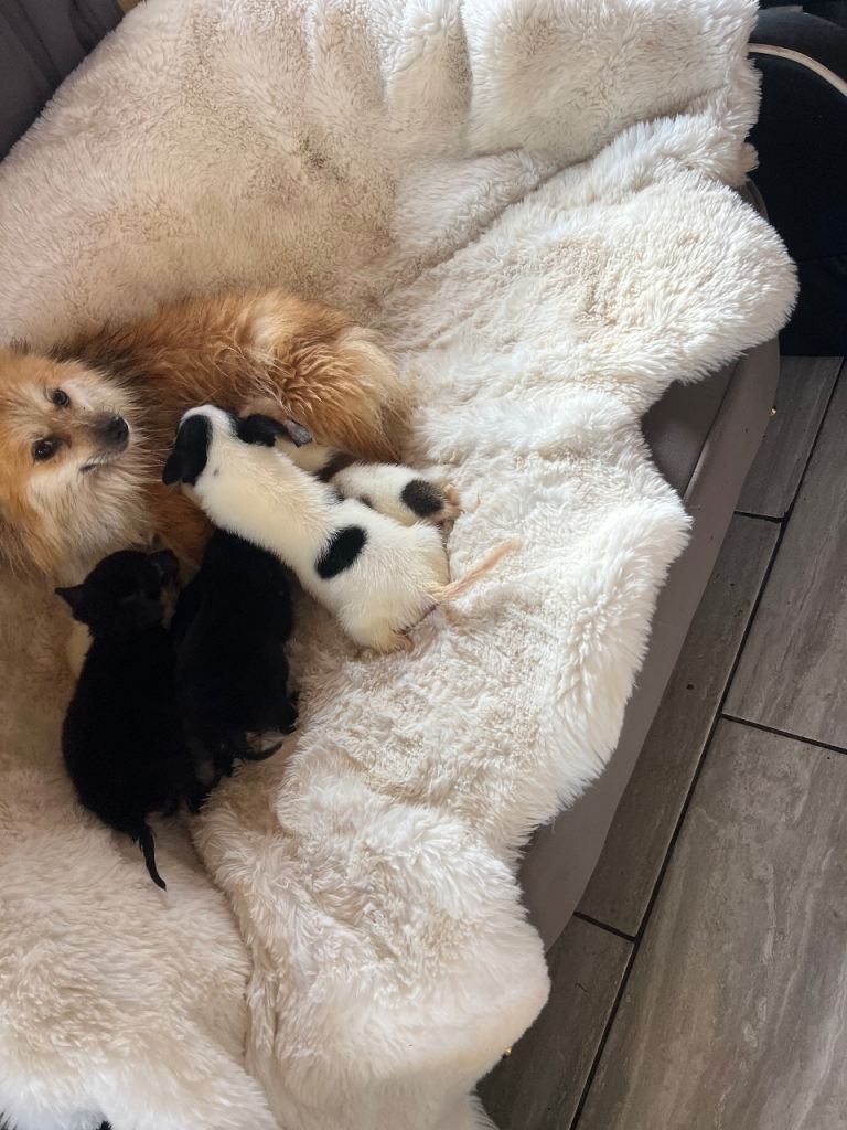 Hi, I have six beautiful pomchi.s Chihuahua cross Pomeranian puppies quite a rare breed mums are pet and a first litter we have two black-and-white boys and two black and tan boys one red girl and one apricot and white boy all been wormed flees and microchip ready for the forever loving homes please no time wasters if you would like more info, please contact me thanks Niomie