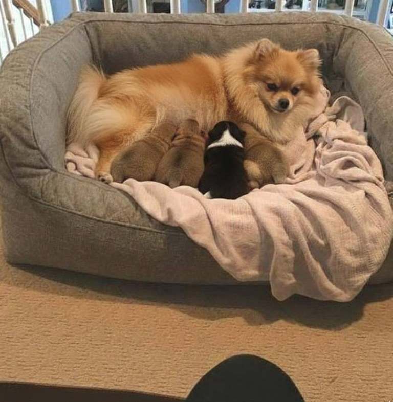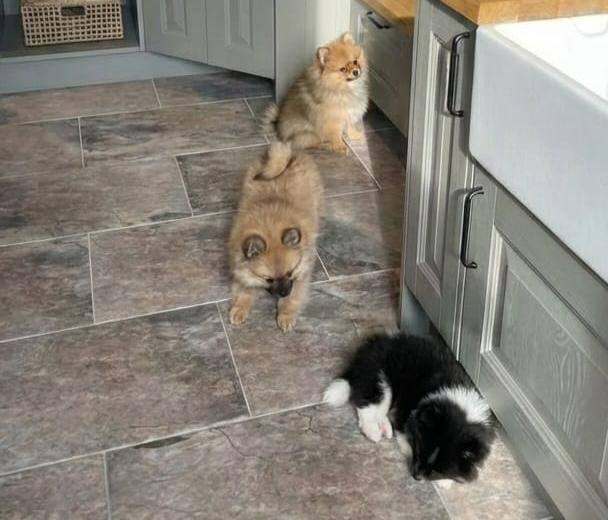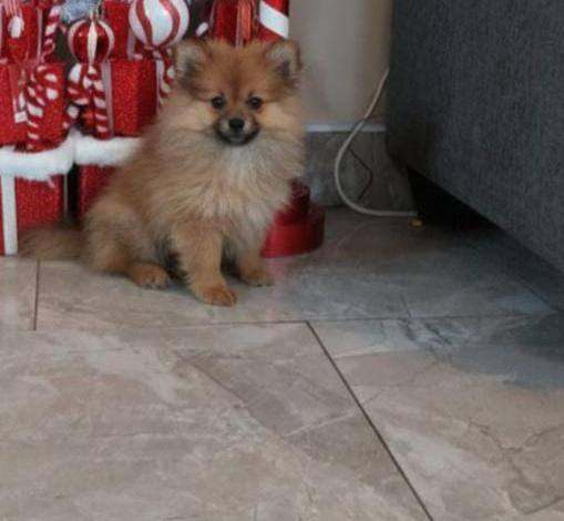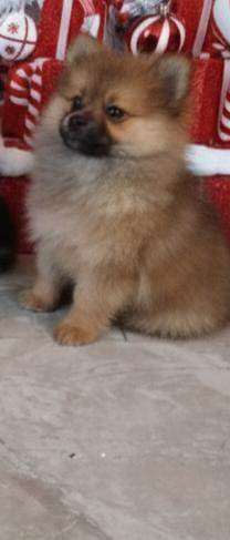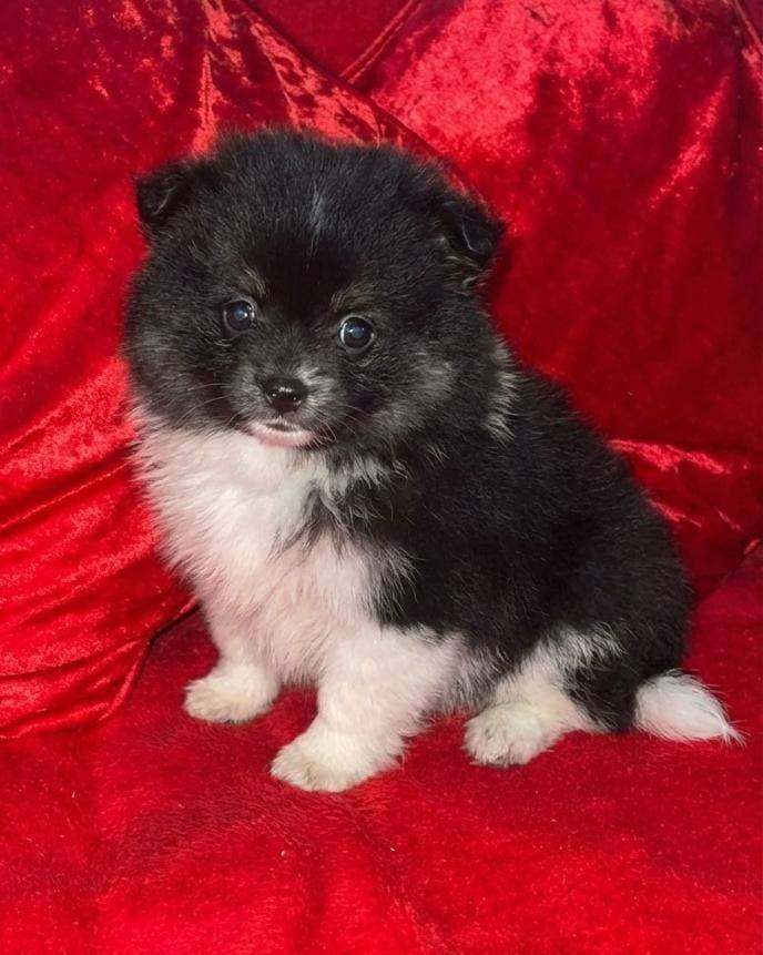 4 healthy, happy Pomeranian puppies 9 weeks old. We have three gorgeous brown pups and one eye-catching black and white pup who is identical to dad.