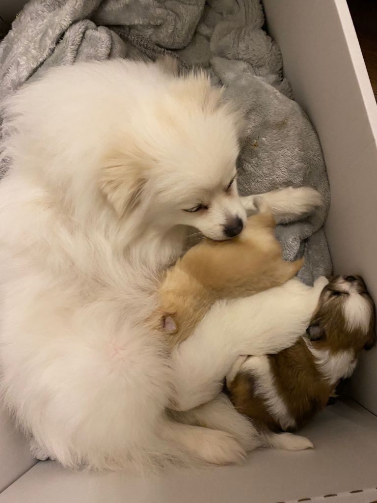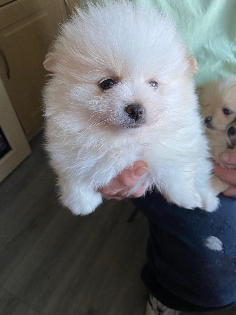 Beautiful Pomeranian puppies. One chocolate and white girl, one white boy and one cream boy. These puppies have amazing temperaments and are very playful and loving. Mum can be seen. She is very loving, loyal and friendly All puppies will be microchipped with their first vaccination, flead and wormed. Looking for their forever homes.