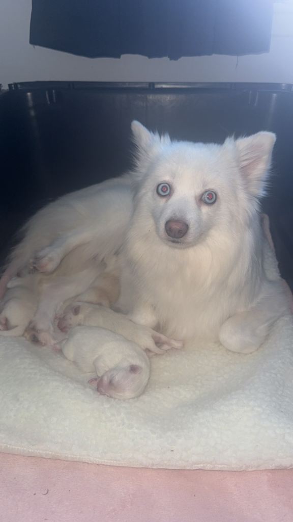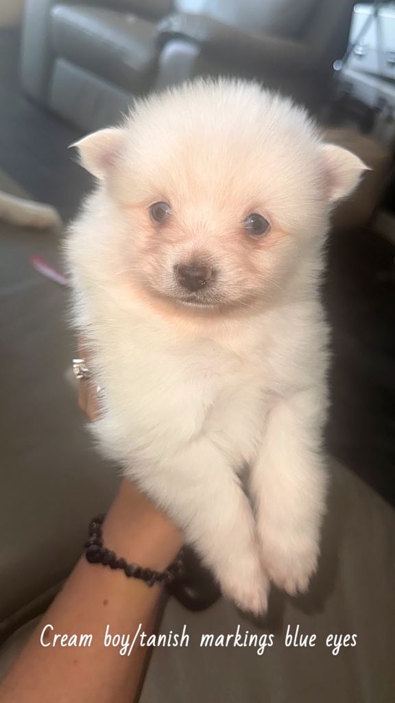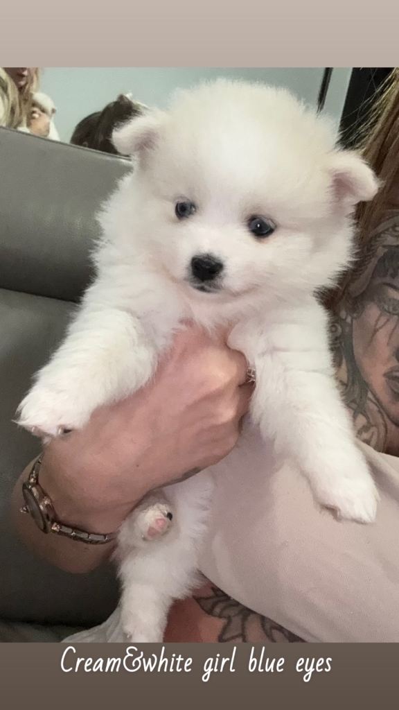 Lottie had her first and only litter of pups on the 12th of January, two boys two girls. Lottie is a healthy gorgeous white blue eye full Pomsky and Ziggy the dad is a cream full breed Pomeranian. I have both mum and dad so they can be seen. They have had their vet checks and microchip. The vet was very happy with them and said they can leave now as mum isn’t bothering with the puppies anymore. £200 non refundable deposit is required to secure your puppy that will come off the total price. I’m not looking for any time wasters so genuine interest only. Please don’t hesitate to message and ask me for any more information.