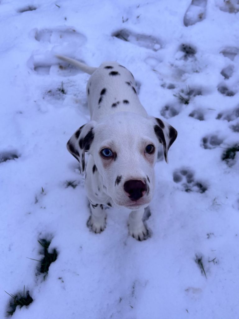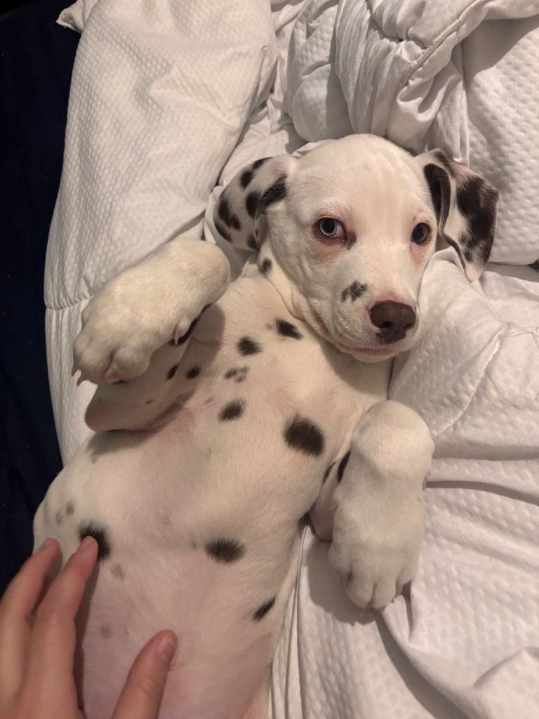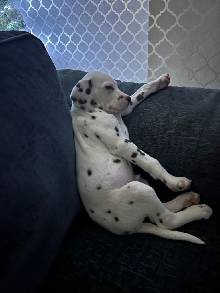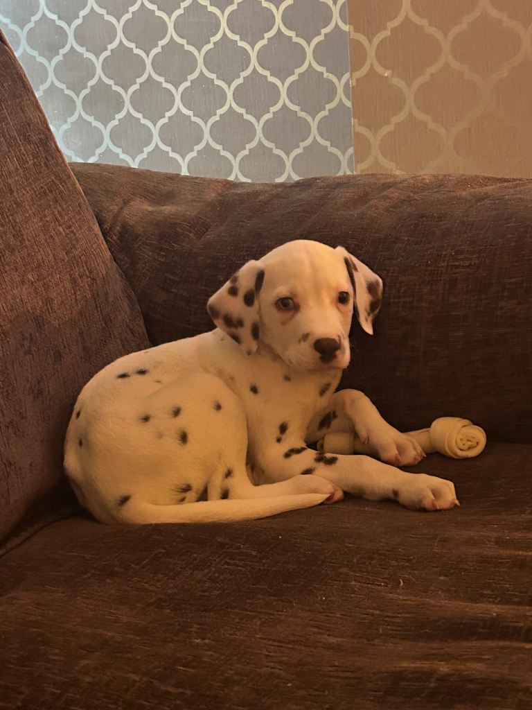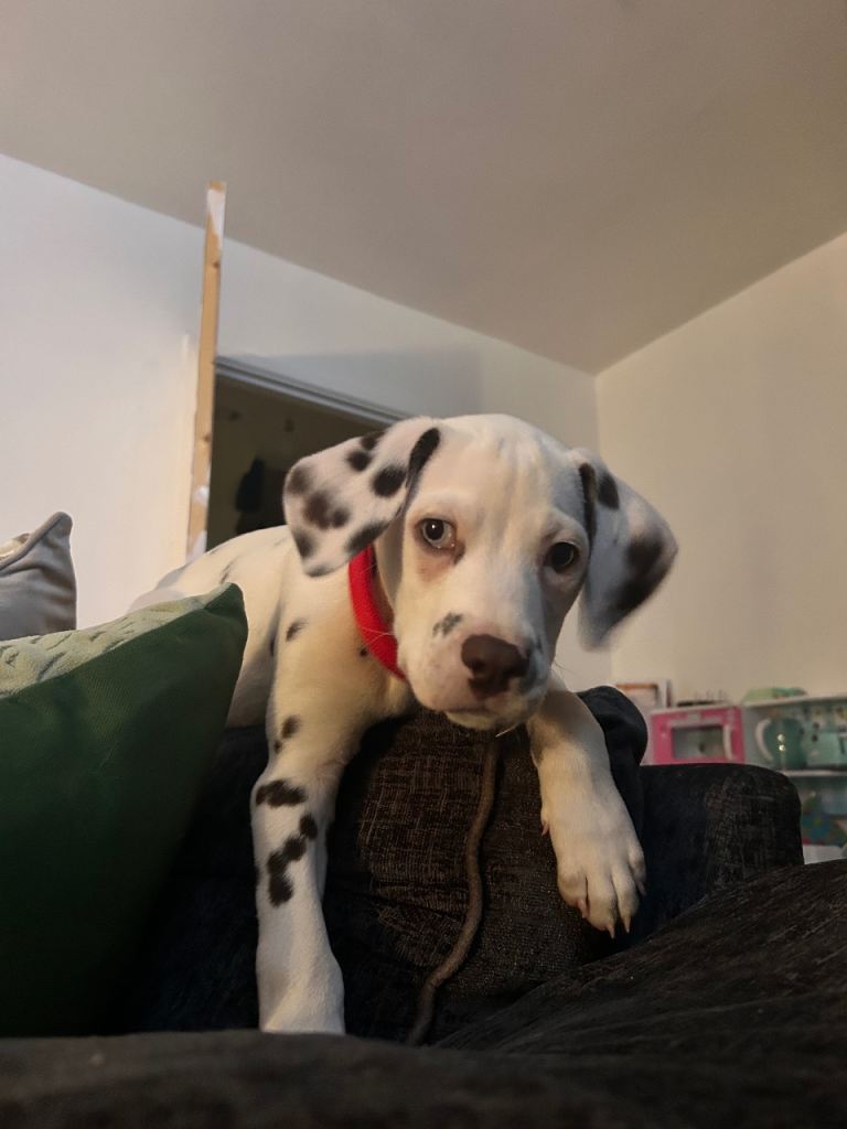 Pongo is a loving bouncy Dalmatian who needs lots of attention and fuss, he is house trained but unfortunately has had no vaccines due to when I got Pongo he had parasites from the mother which caused belly problems so the vaccines had to go a miss, he is fit and well for them now, unfortunately am having to rehome due to change of jobs I won’t no longer have the time for him, as I’ll be out the house 7 hour from the 9th February, it’s hit us hard he was born on the 16th October, he is death in his right ear, he has one blue and one green eye and is liver spotted he needs some support with his bitting when he gets over excited, he’s learnt sit and paw, he hasn’t yet been on walks but has been on my garden on the lead to get him used to it.