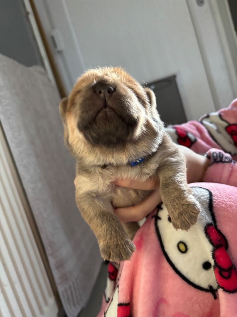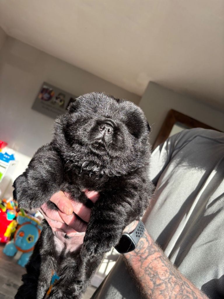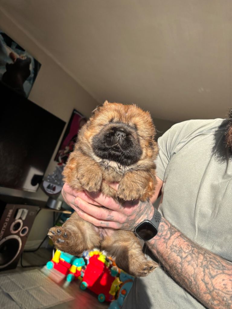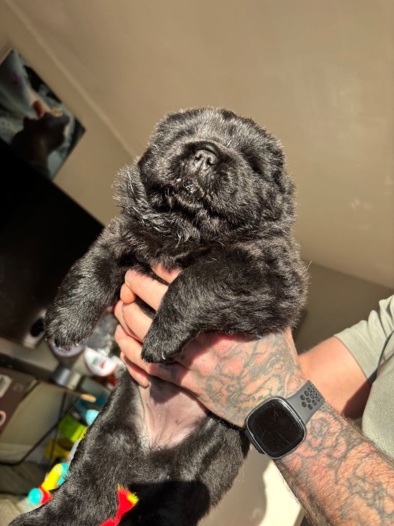 their is 5 in total 2 are black one girl one boy , a cinnamon boy , a browny brindle girl and a red tan boy who is the biggest of the litter the mom is shaded red and the dad is chocolate can provide picture from a loving home with children £ 1500 for the boys and £1600 for the girls deposit of 250 for all of them