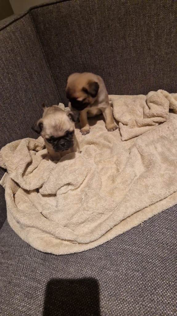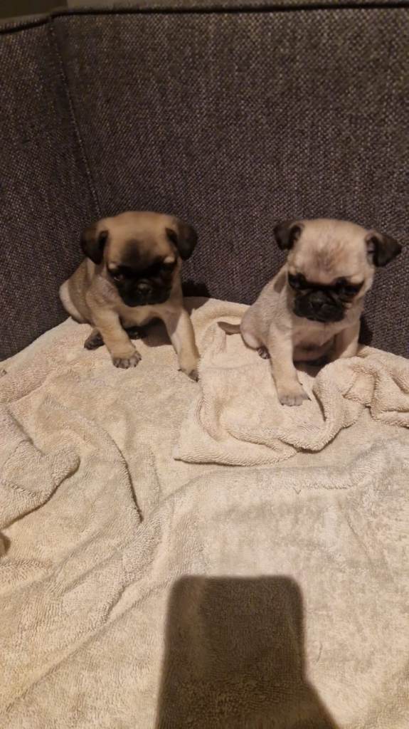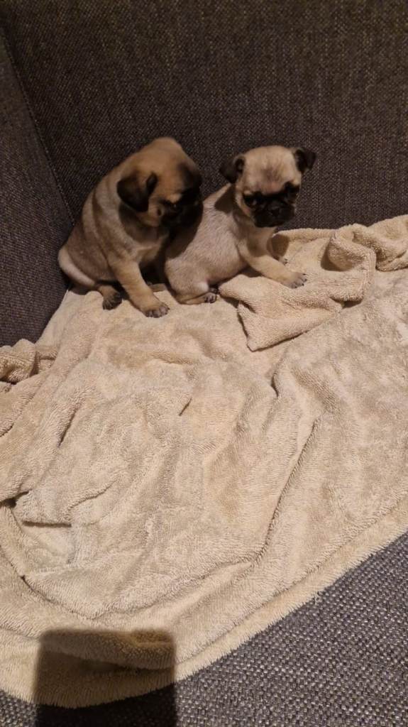 Pug puppies, looking for their new loving homes born and raised in our family home they have been around my kids since birth they are used to loud noises and a hectic household we wish them to go to a loving home there is boy and girl available puppies are microchipped and their first vaccination have been regularly wormed