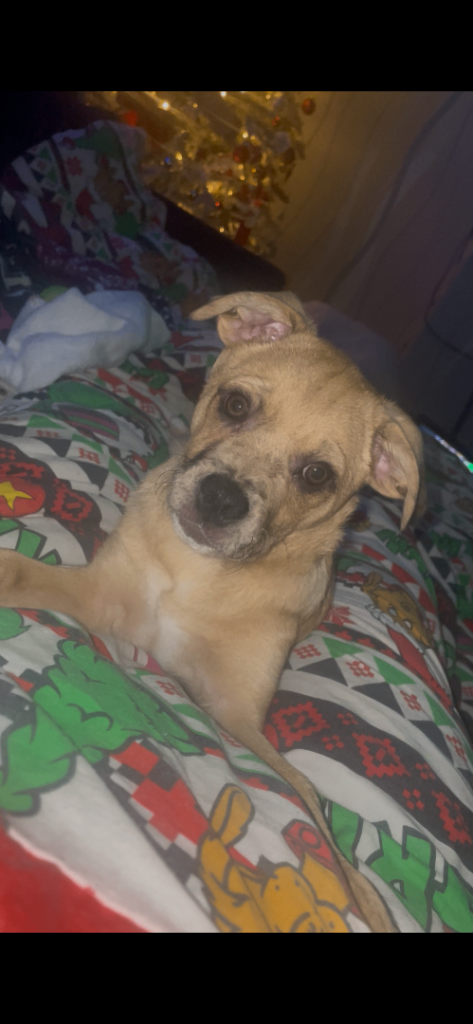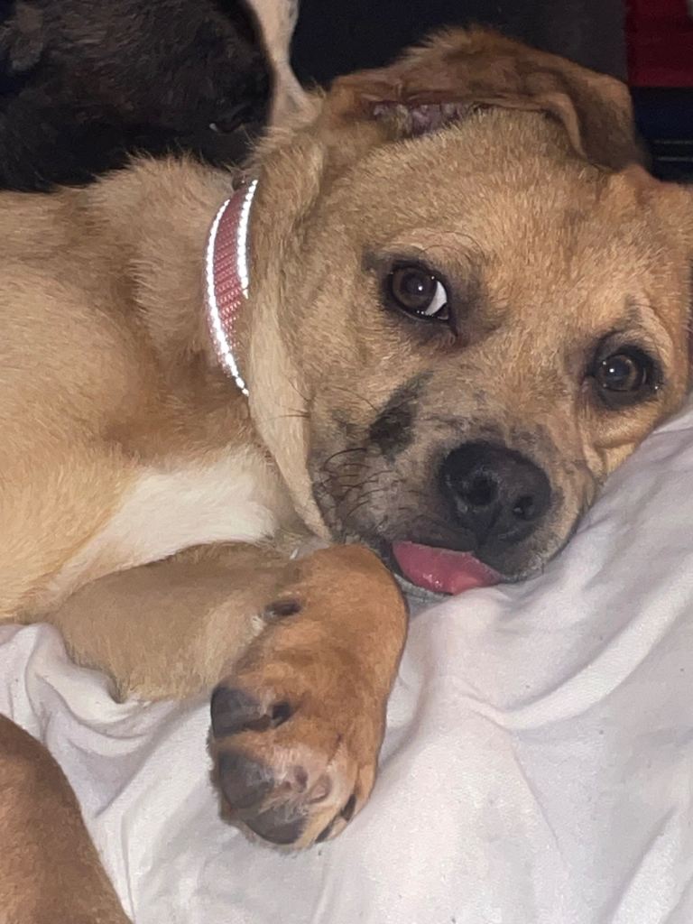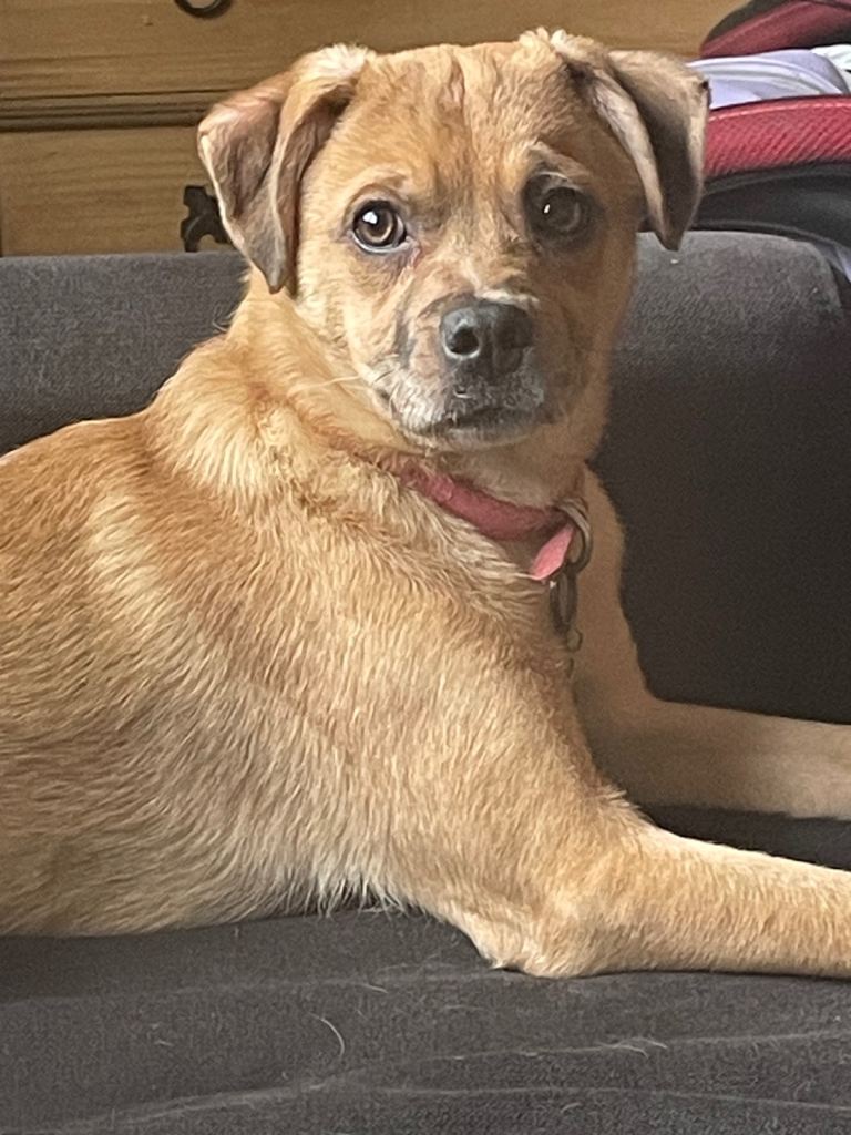 Cleo is looking for a new home, she is a pug x collie. So very unique breed, she is 6 months old, she is thriving in training, she knows how to sit. Stay. Basics, she walks on her lead but does not have recall yet.