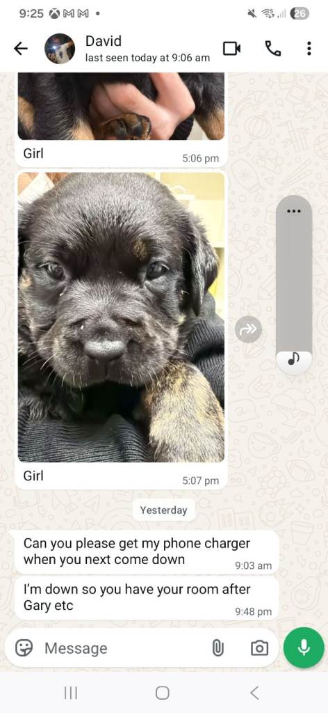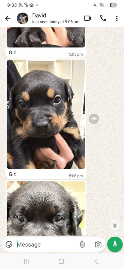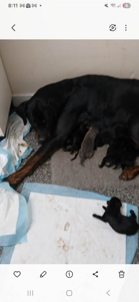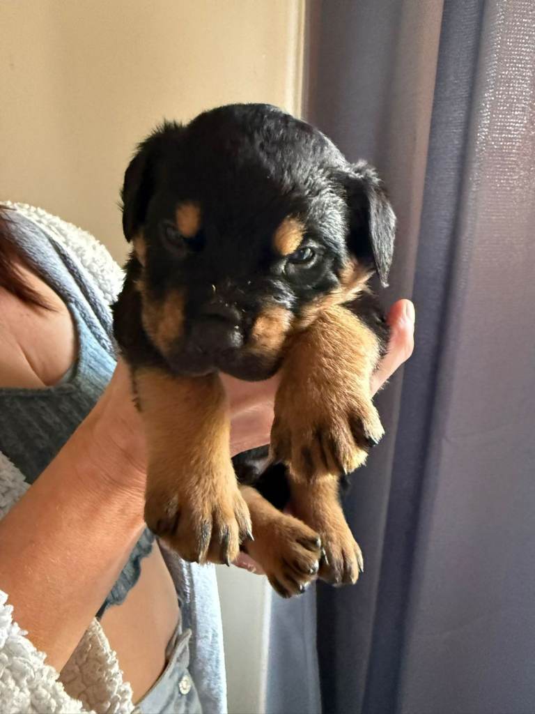 They are 5 weeks old they are cross rottweiler and Doberman mum is a fantastic mum now her second litters. All pups are eating raw fresh meat brilliant for the coat and health. All puppies rady to leave at 8 weeks all will have first jab and chip.