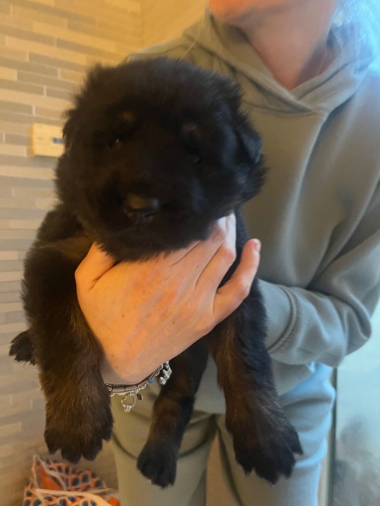 • Dad: Long-haired solid black German Shepherd.