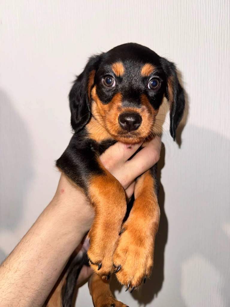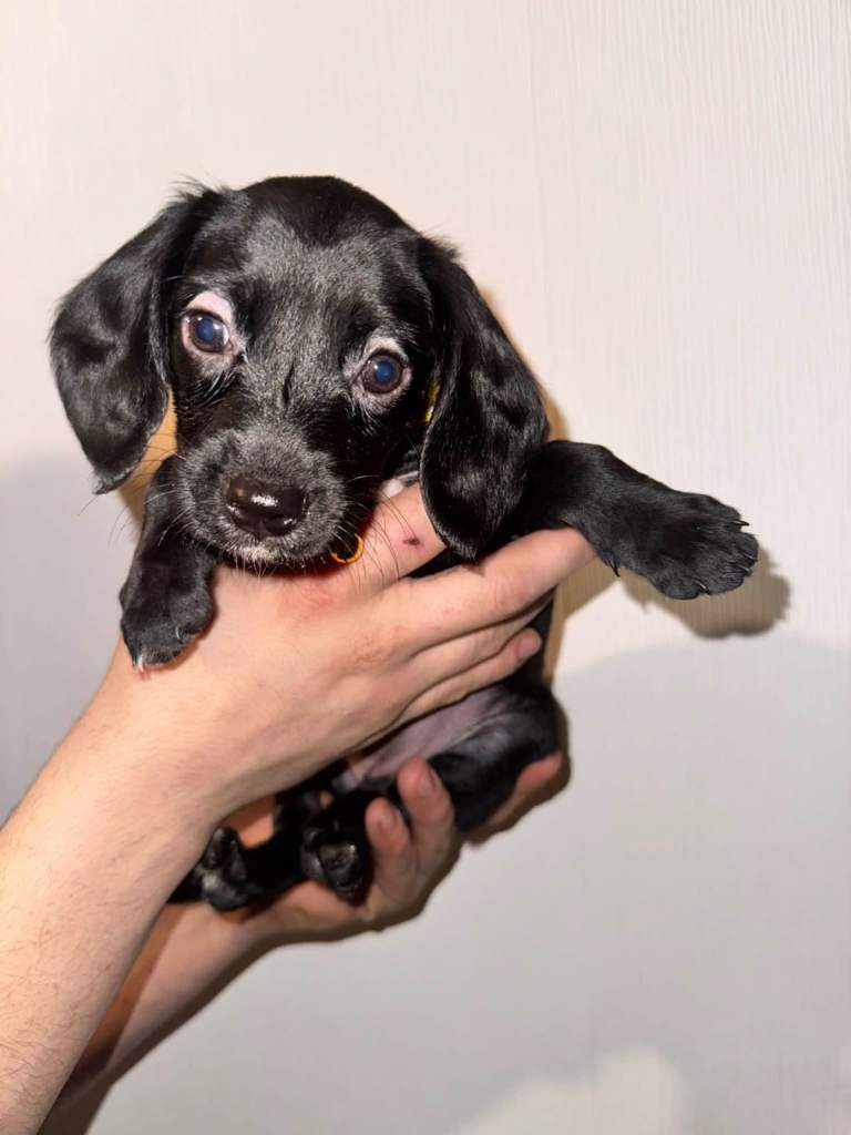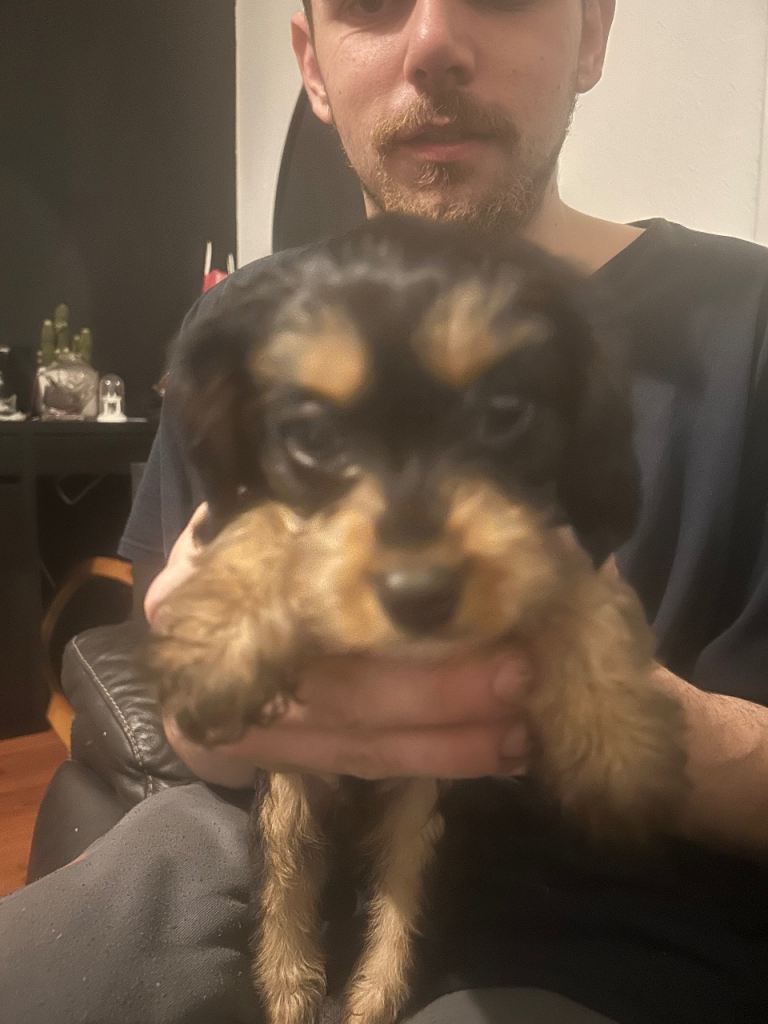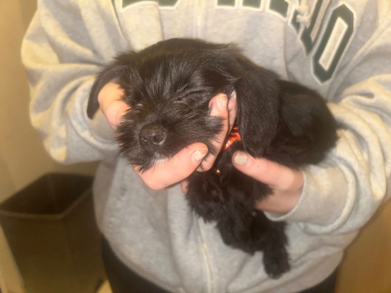 Puppy 6- orange- a very very active playful fluffy coat little all over black puppy. He’s the leader of the games definitely. He will just play and play until he collapses. Very likeable little puppy.