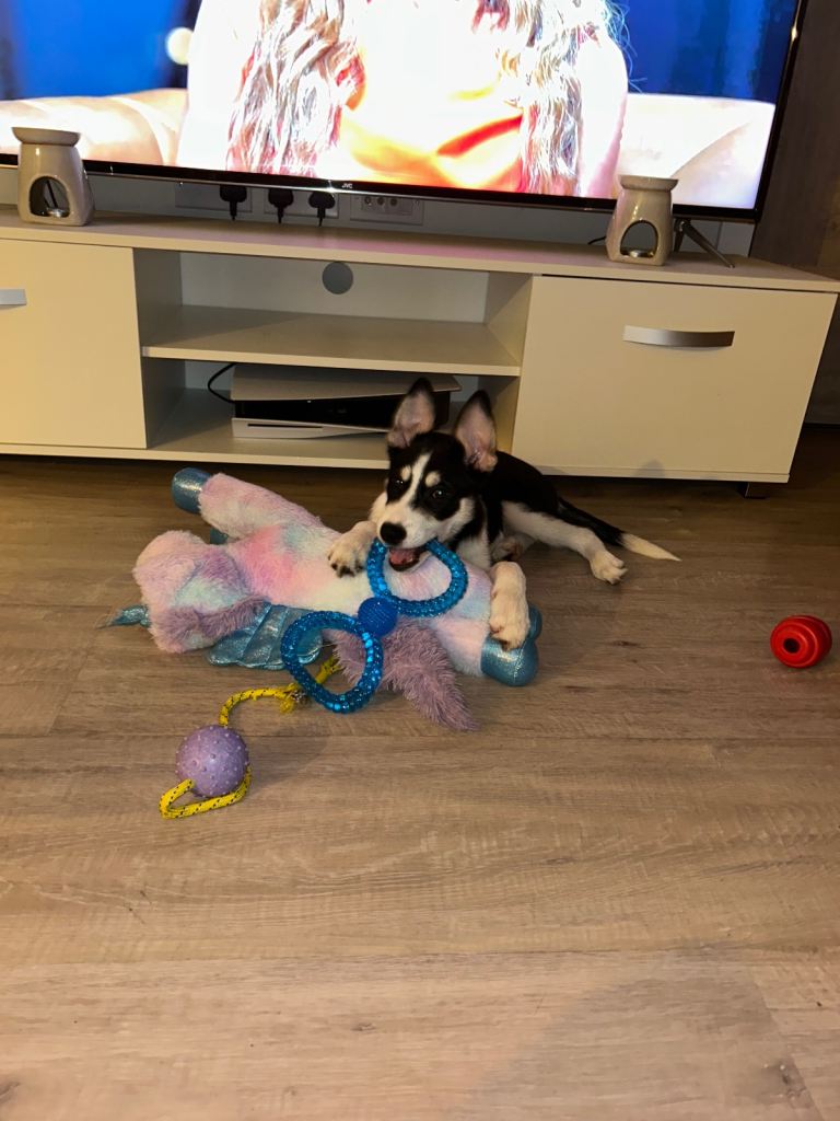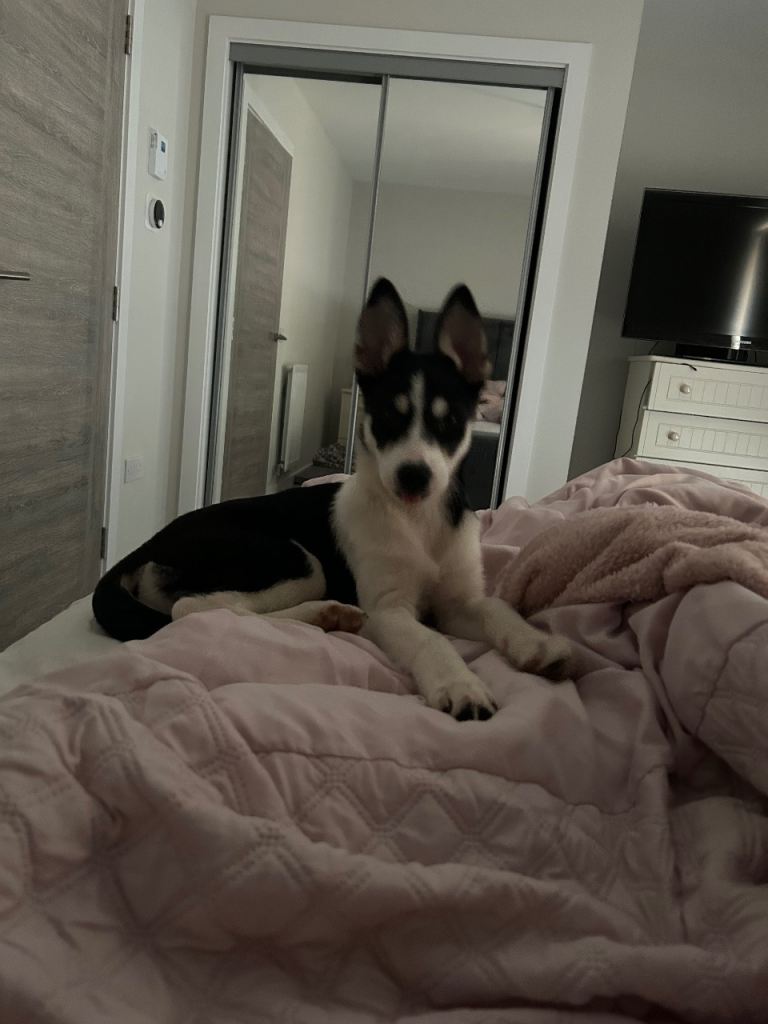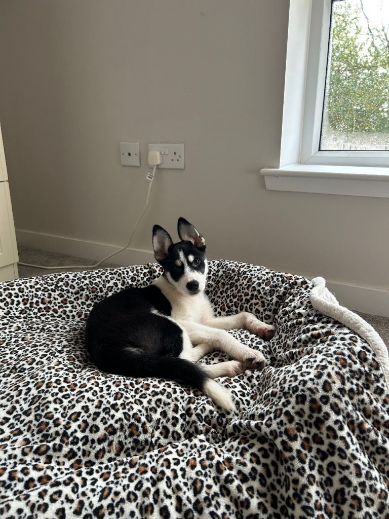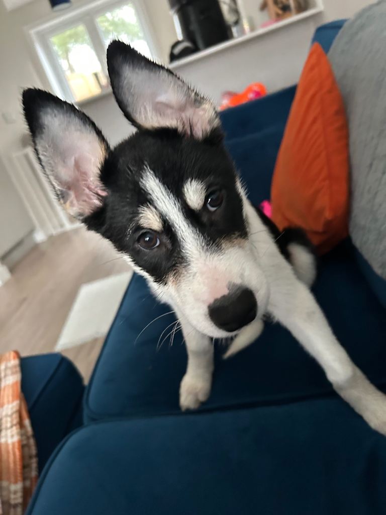 Due to unfortunate circumstances I am having to re-home my gorgeous little puppy. She is 16 weeks old. Border collie / husky cross. She has lots of energy, she loves cuddles and long walks. She is such a loving girl and would be a great addition to a happy loving household. She is good with children and other dogs. She is so playful and fun! I want her to have a happy life and to be loved and taken care of. If you are interested or would like further details then please contact me. She is doing great with her toilet training and goes out to the garden every hour and overnight she sleeps well. She will come with her bed, blankets, food and water bowl, her harness / lead, a jacket and her toys.