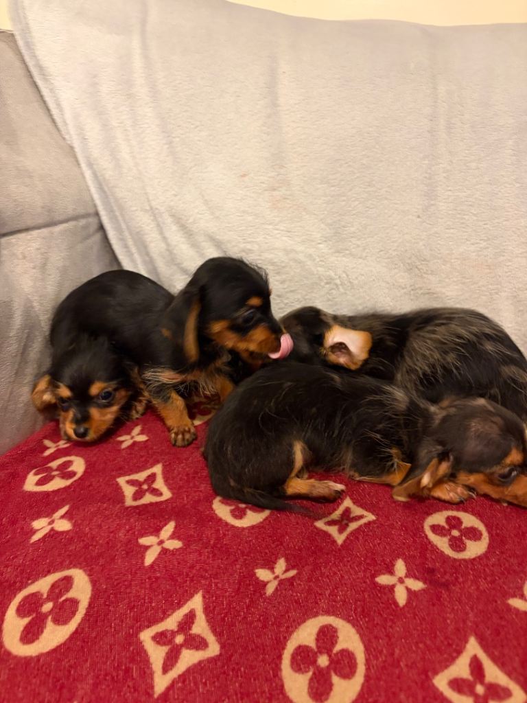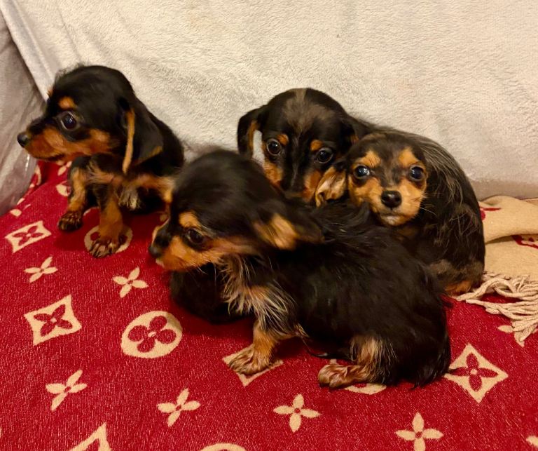 Lovely little litter of dachshund pups 8 weeks old and looking for there forever homes all pups are microchipped and fleas and wormed they can be visited with there mum how is a silver dapple and there dad is a solid chocolate boy who cares the long hair gene pups are all tiny and are eating and drink on there own great with kids
