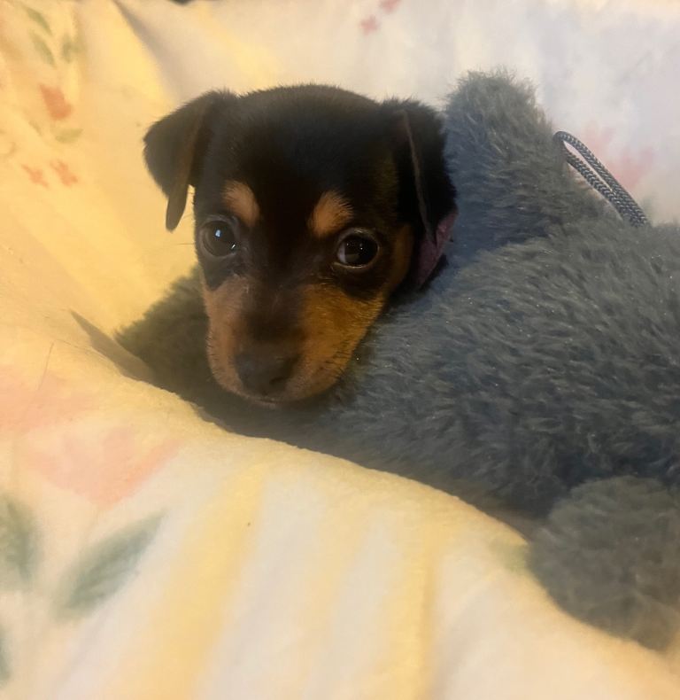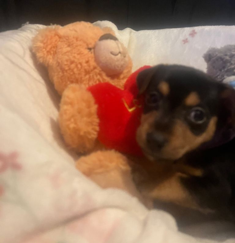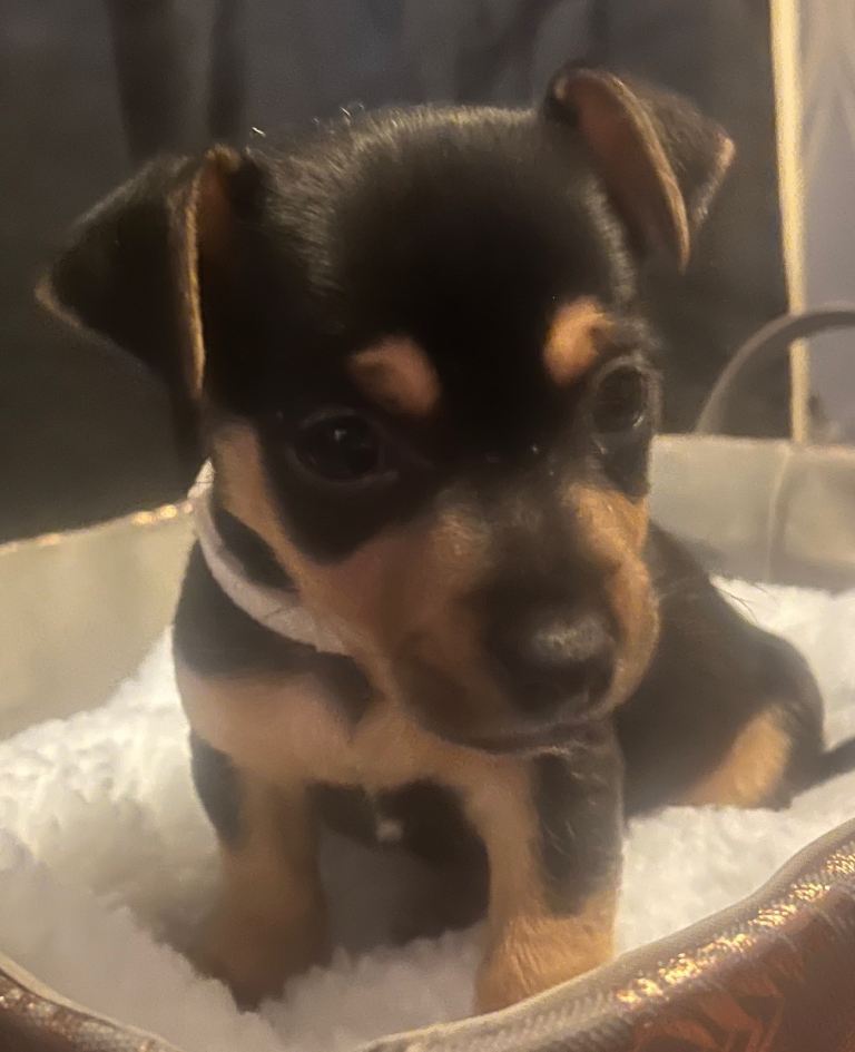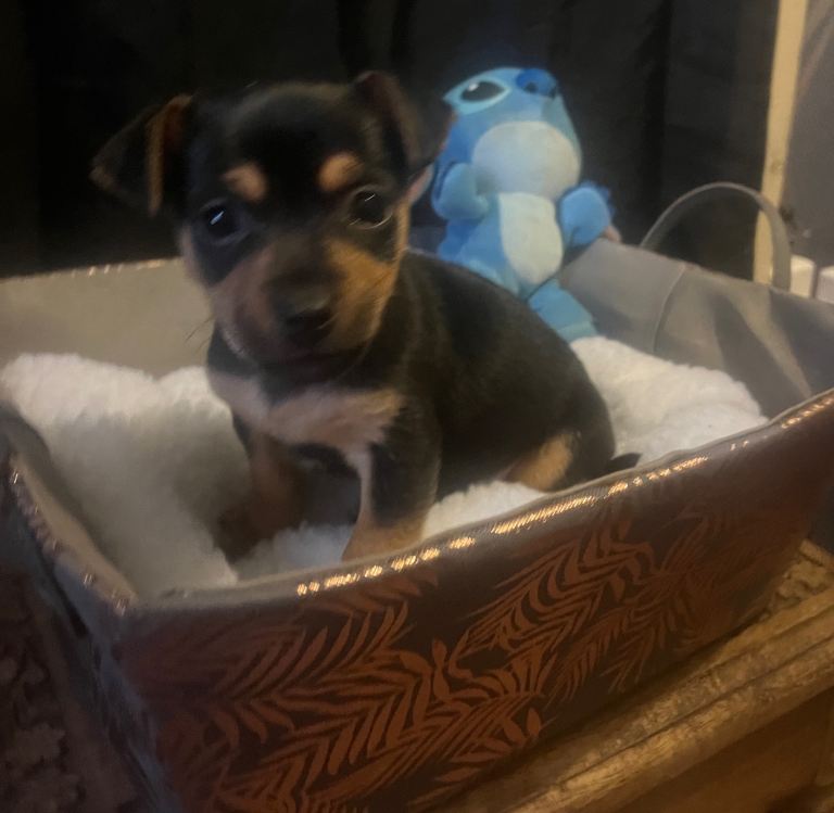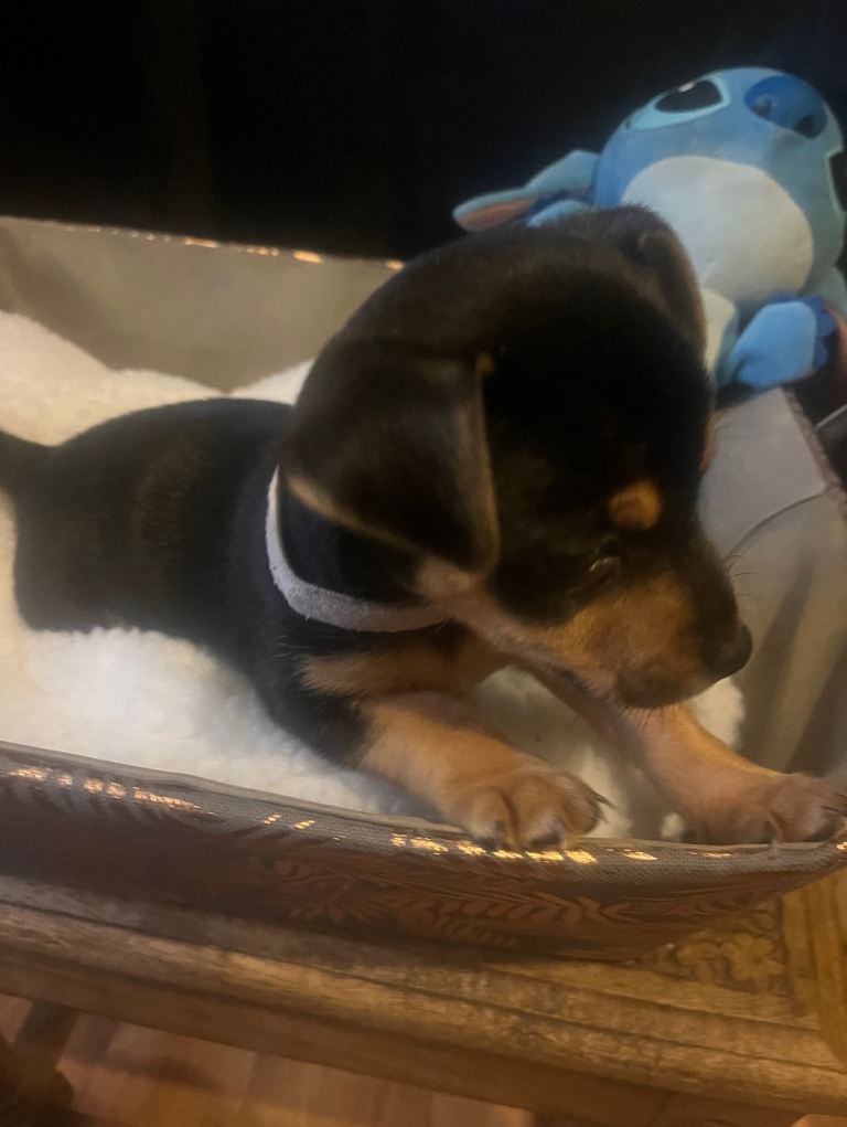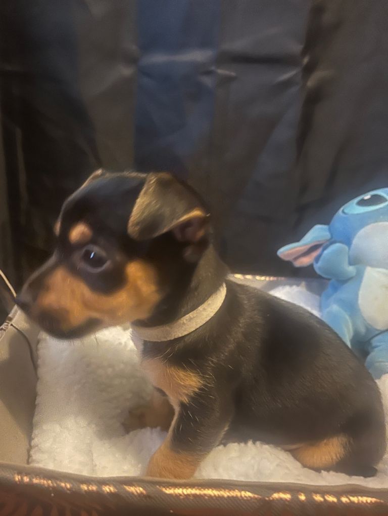 Puppy 3 - £600- White collar- Black and Tan adorable little boy has a full tail. He certainly is the one that loves attention and will respond with his own affection back. He will happily curl up on your lap and snuggle with you all day. He is also puppy pad trained.